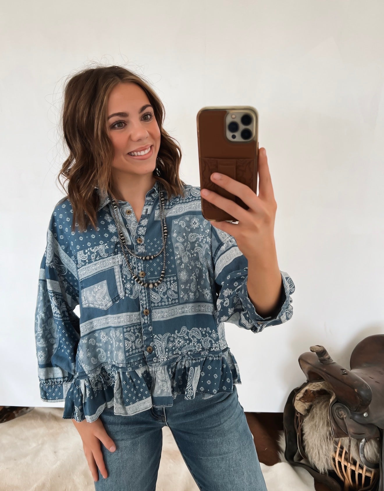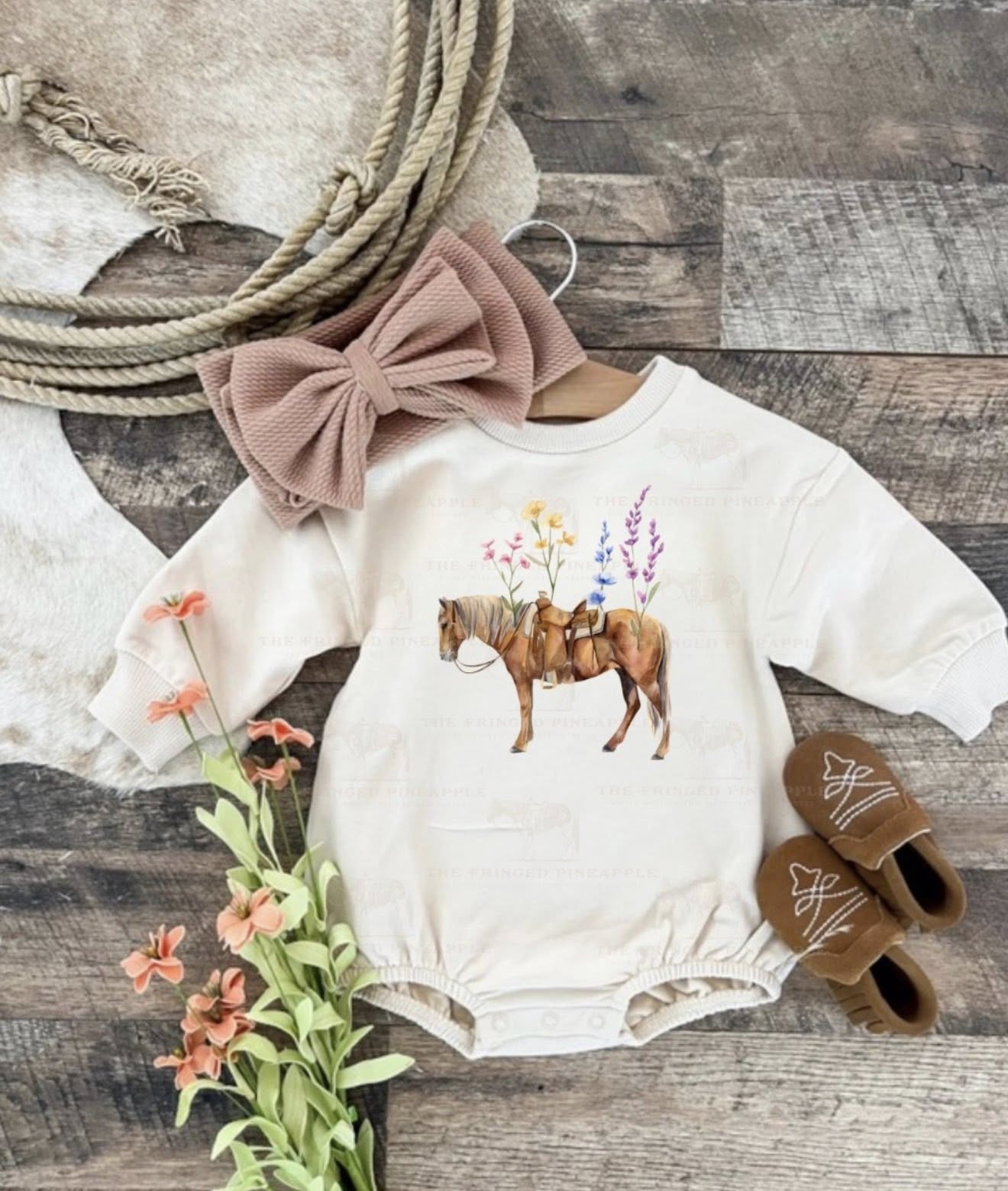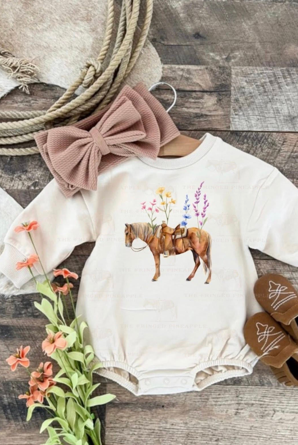 Wildflower Saddle Horse Western Easter Shirt | Long Sleeve Bubble Romper (Cream)