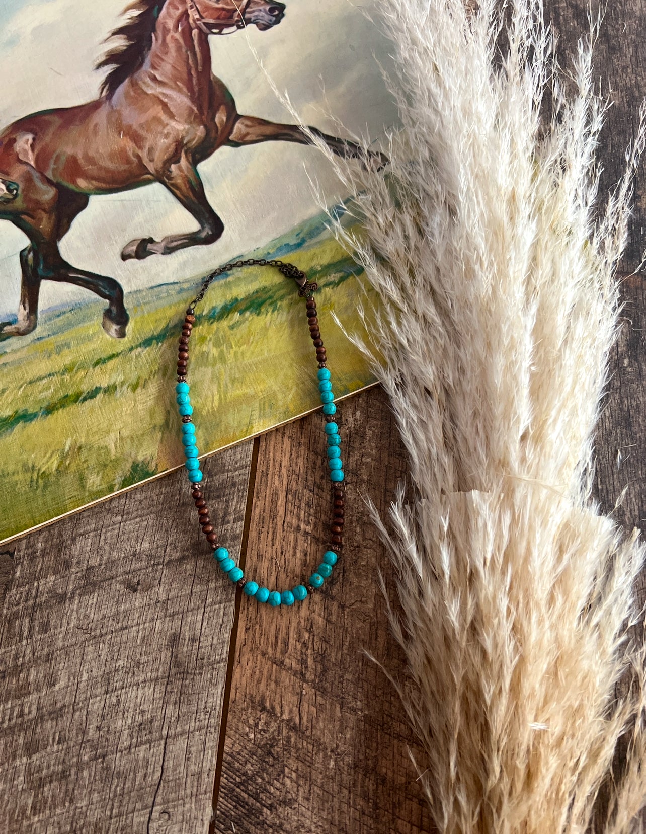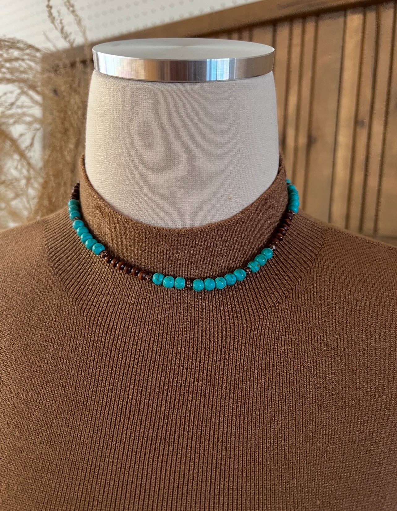 Beaded Choker Necklace features a combination of Blue Turquoise Choker is meant to be worn above the collar bone. Great for layering or as a statement piece. Entire length of necklace is 15 inches end to end, which includes a 2" extender chain.