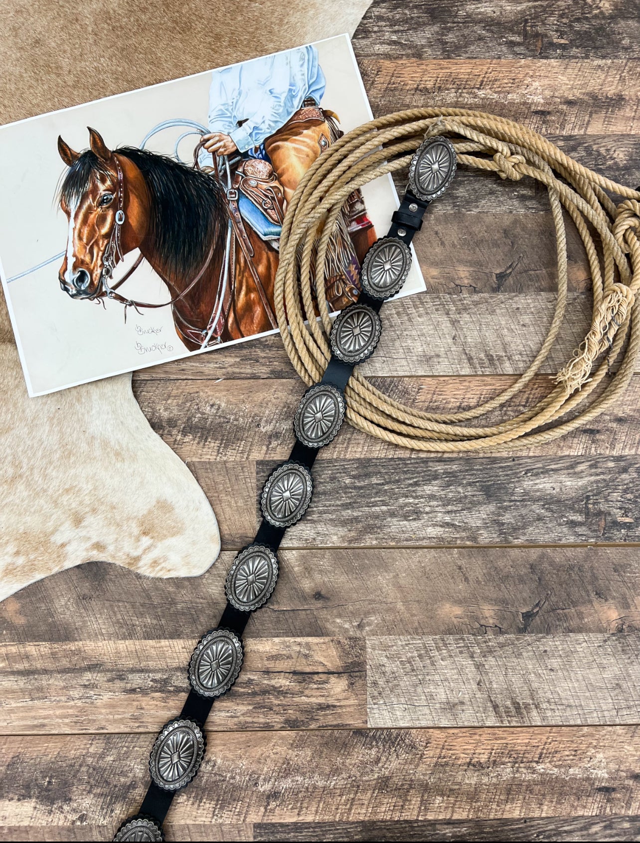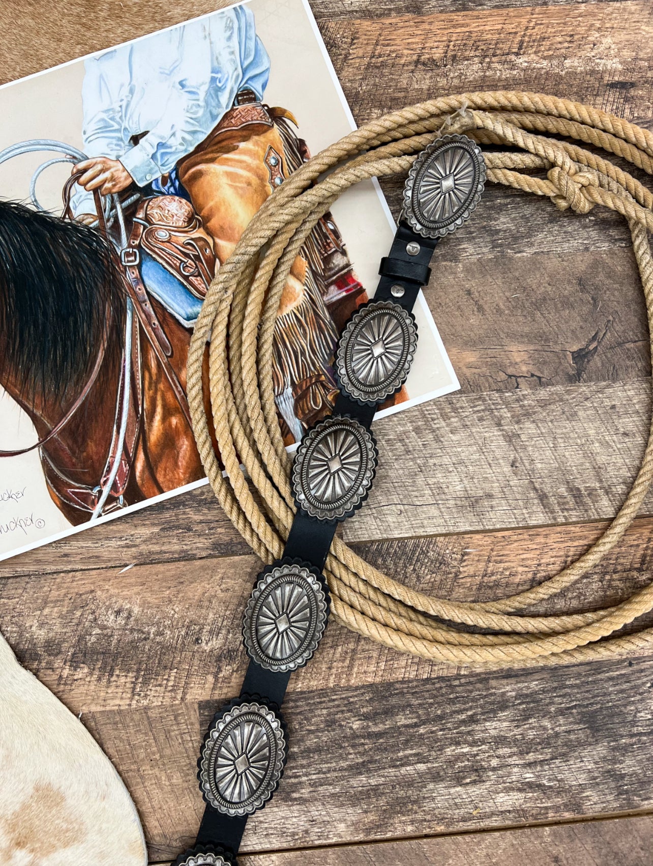 Elevate your Western style with our Vintage Leather Silver Concho Belt in classic black. Crafted from solid genuine leather, this belt showcases a series of intricately engraved oval silver conchos that add timeless character and rustic charm to any outfit.Each concho is fully adjustable, allowing you to customize the spacing and fit for the perfect  accent around your waist—whether you're pairing it with denim, dresses, or Western wear.
