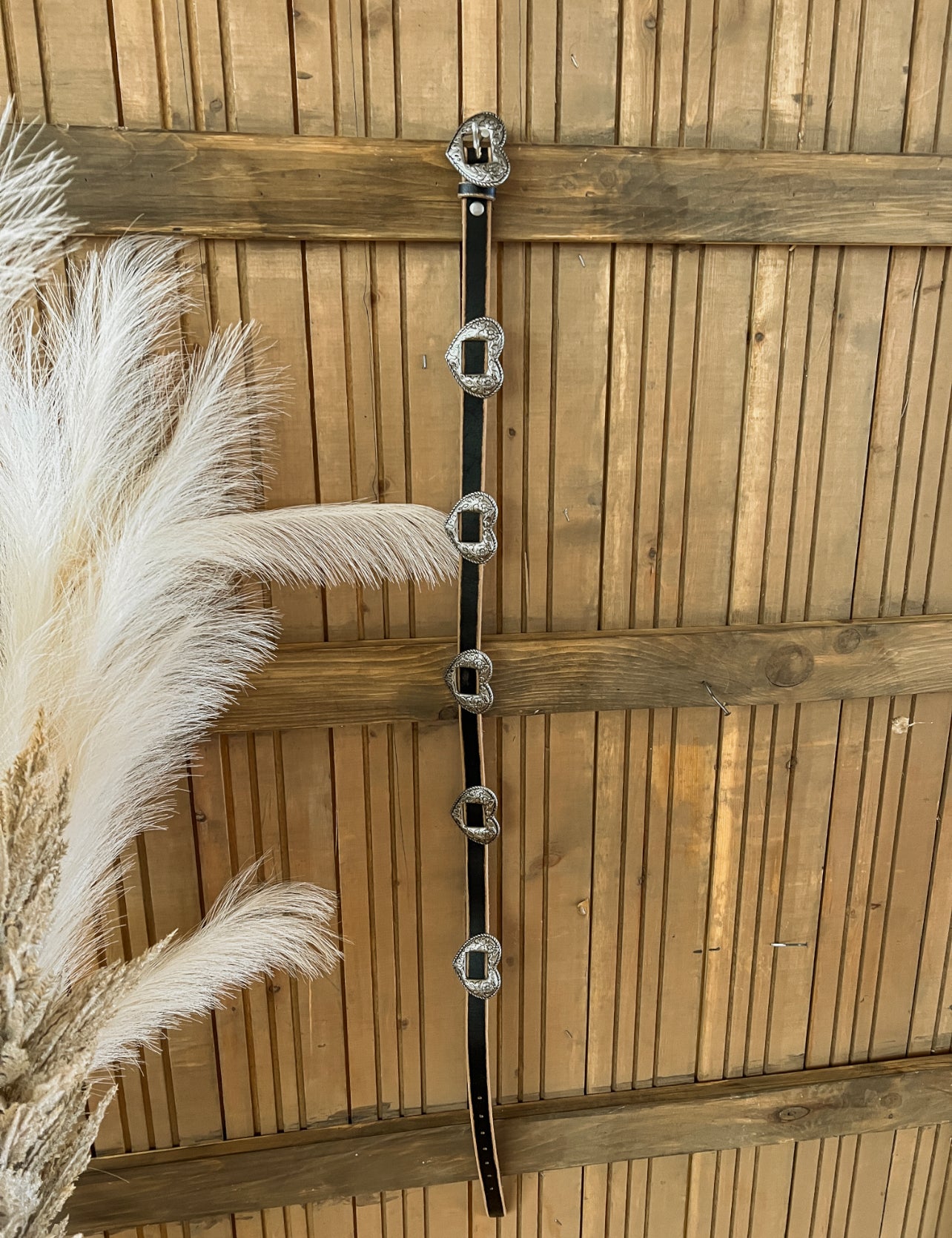 Dimension of buckle is 2.35" x 1.7" Rope edge detail and floral etched on each metal buckle and concho One buckle plus 5 conchos, total 6 hearts on the belt Width is 3/4". Leather is 100% genuine leather, in Vintage , edge distress hand finish in black