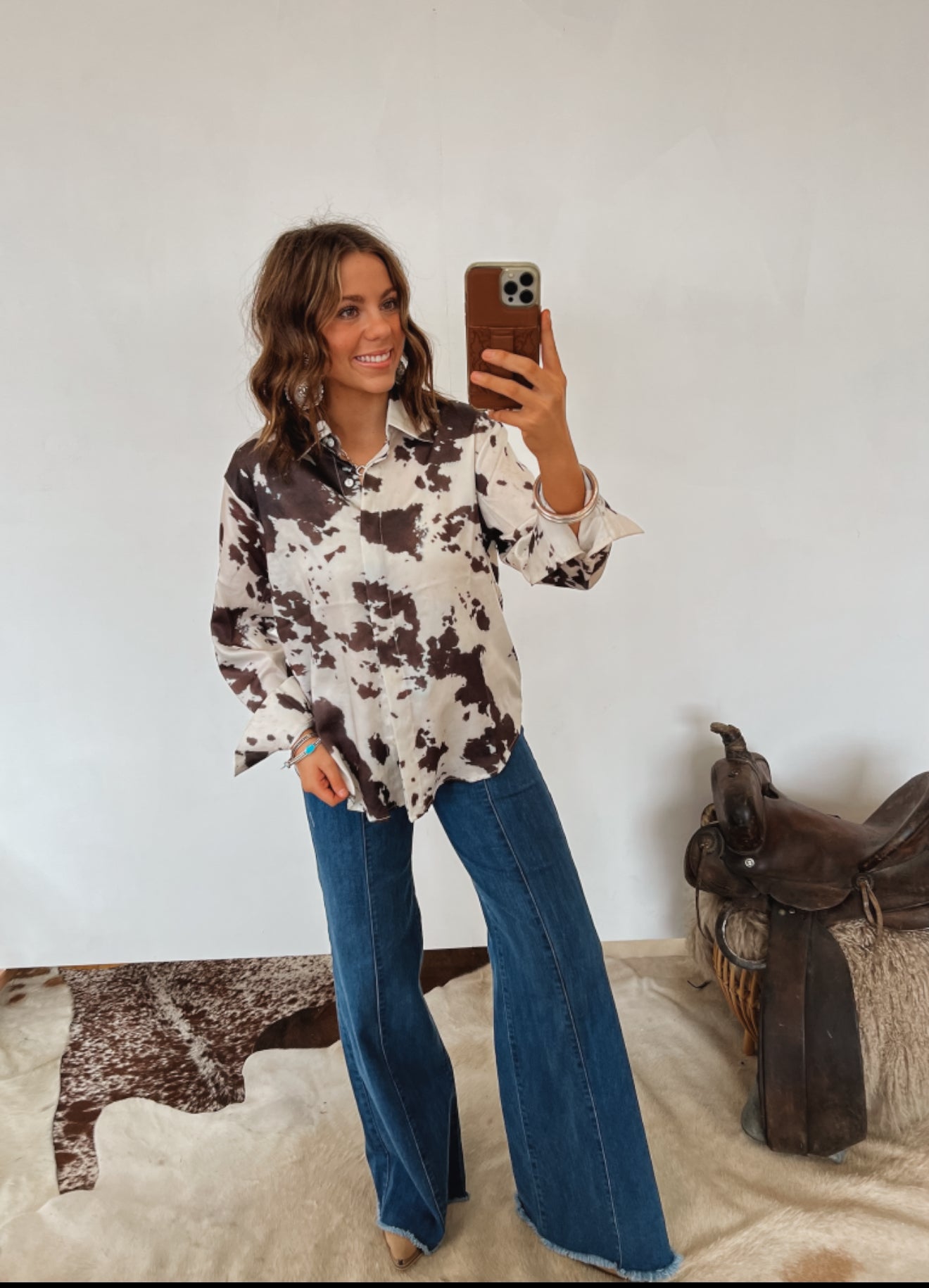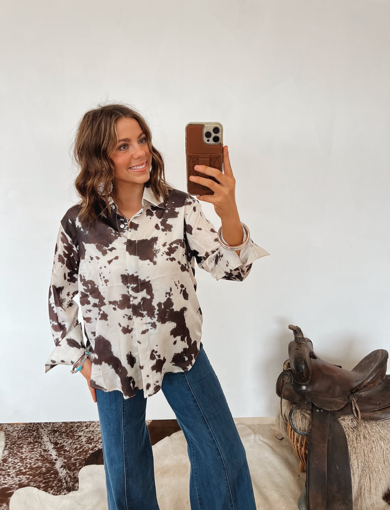Bold, airy, and unmistakably western — the Cowhide Button Down brings a fresh take to classic cow-print style. Made from a lightweight, breathable cotton blend with a hint of stretch, this relaxed-fit button down drapes beautifully and keeps you comfortable from sunup to sundown. The abstract cowhide pattern adds the perfect boho-western touch, giving the top a cool, elevated feel without trying too hard.