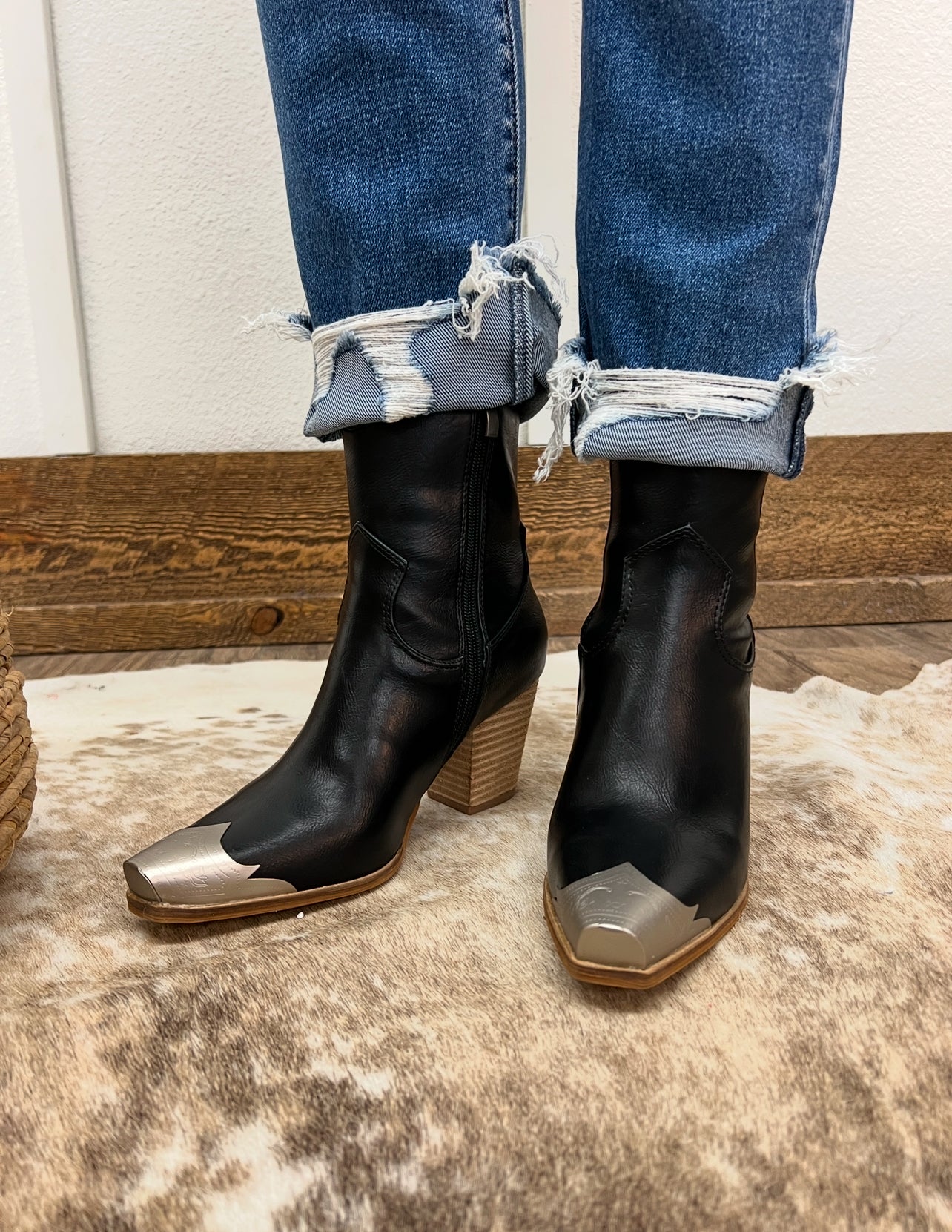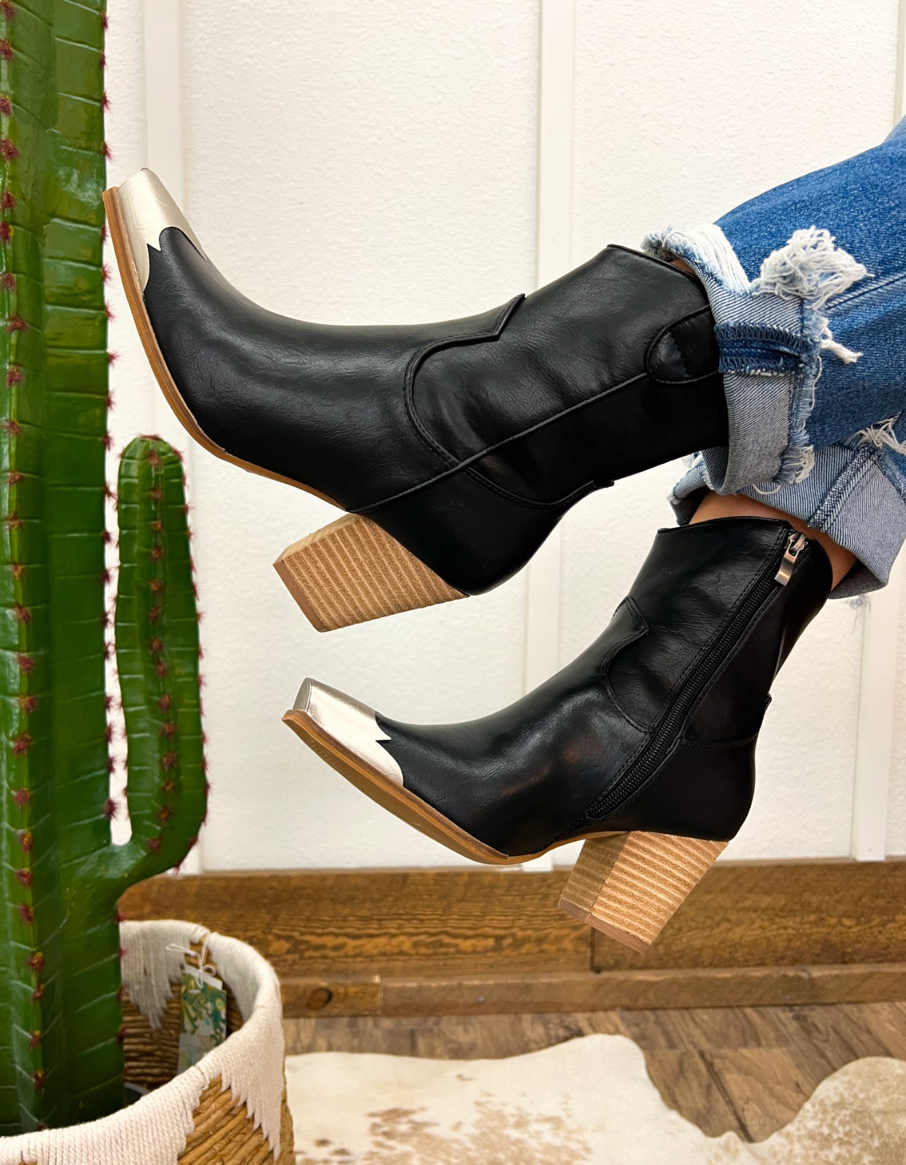 Hello Gorgeous, METALLIC SILVER TOE TIP WESTERN COWBOY BOOTIE FAUX PU LEATHER SHAFT HEIGHT: 6.5" HEEL HEIGHT: 3"