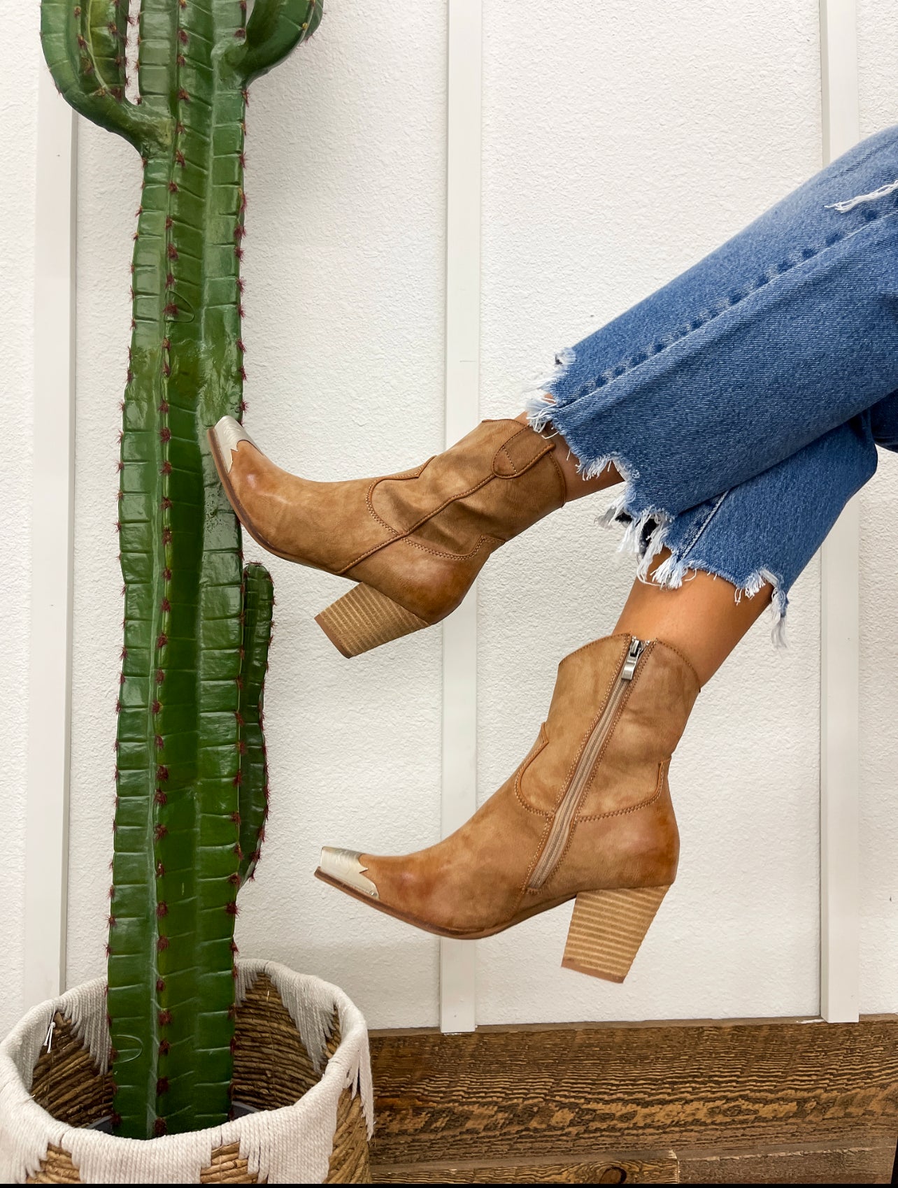 METALLIC SILVER TOE TIP WESTERN COWBOY BOOTIE FAUX PU LEATHER SHAFT HEIGHT: 6.5" HEEL HEIGHT: 3"