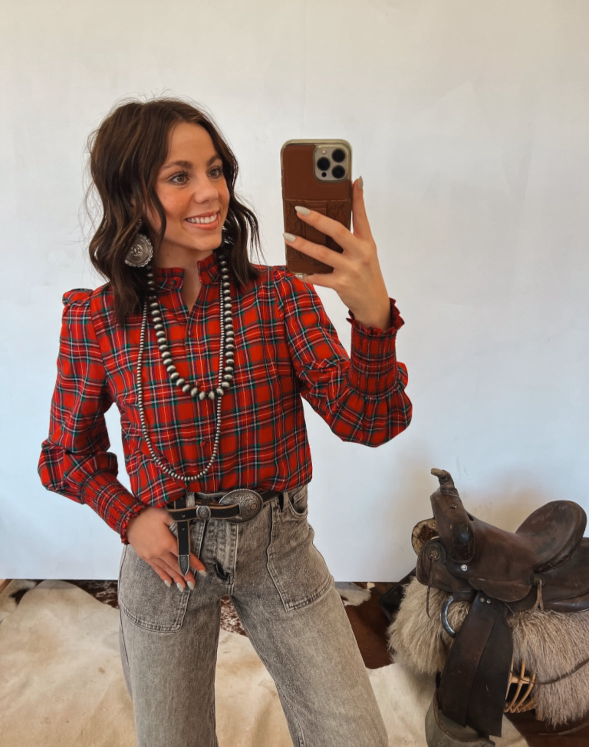 Festive, fun, and full of flirty western charm — the Christmas Plaid Ruffle Blouse is the perfect holiday-season statement top. Designed with a bold red checkered plaid, this blouse features dramatic ruffle accents and smocked details that bring texture and personality to every outfit. The lightweight, flowy fabric makes it an easy, eye-catching piece you'll reach for all season long.