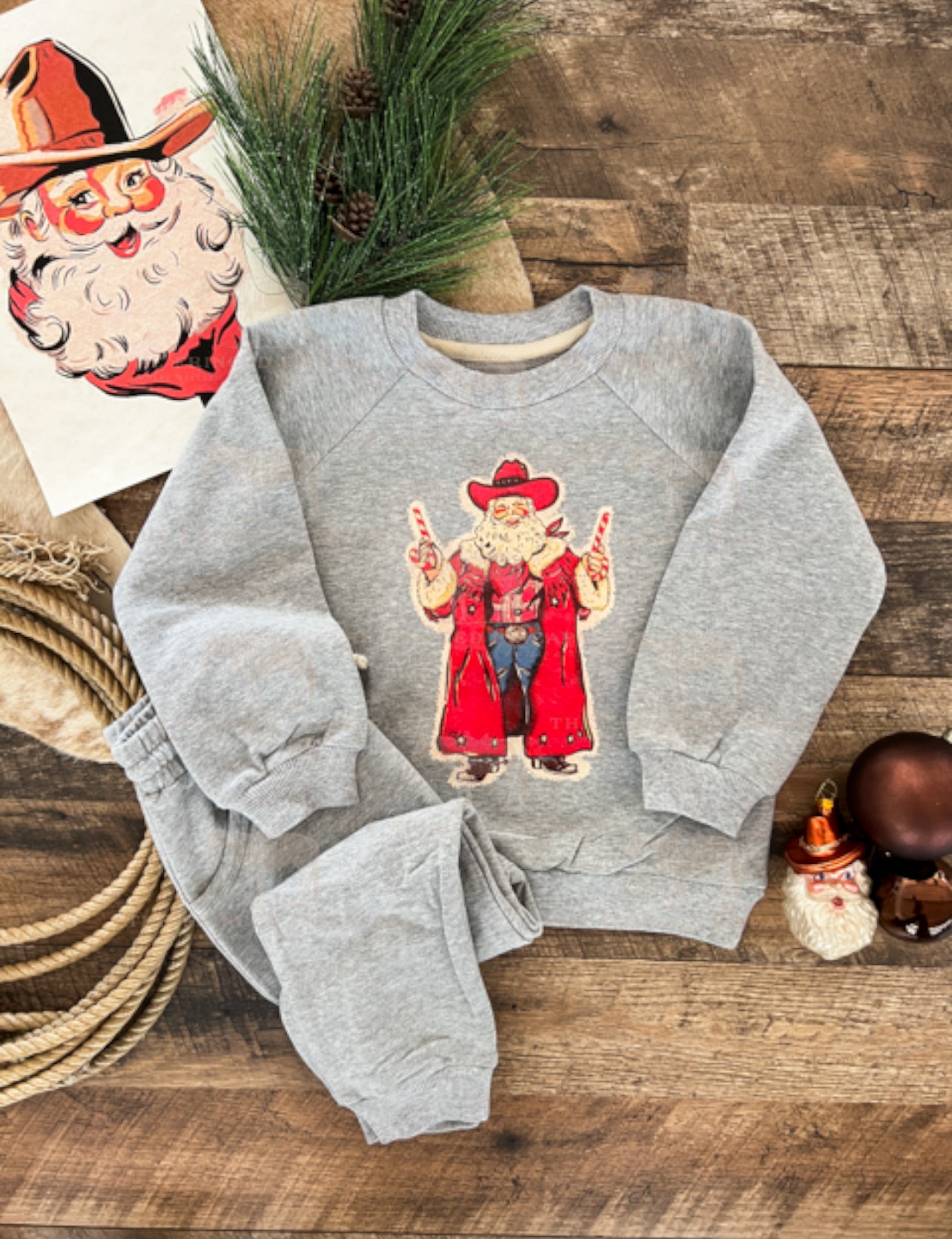 Let your little one show off their festive Western spirit in our Outlaw Santa Lounge Set! This cozy matching set includes a crewneck sweatshirt and joggers featuring our exclusive Outlaw Santa design printed on light heather grey tones. Perfect for Christmas mornings, travel days, or lounging in cowboy comfort all season long.