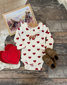 Your little cowgirl will be dressed in pure sweetness with The Good Horse Cream Heart Ruffle Onesie — the perfect mix of western charm and darling Valentine style.