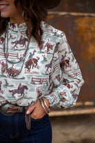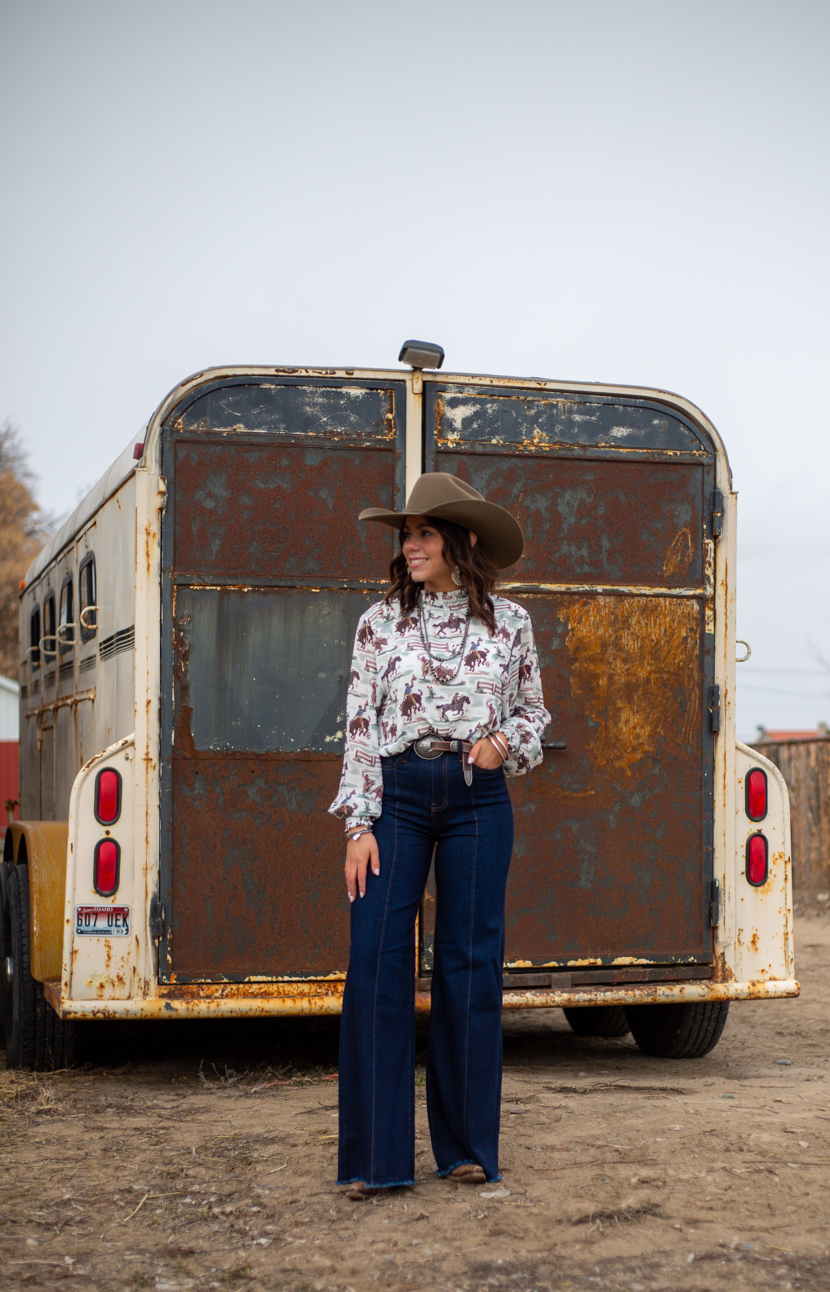 Classic cowboy charm meets boutique exclusivity in the Ole’ West Cowboys Mock Neck Blouse — a one-of-a-kind statement piece you won’t find anywhere else. Featuring an all-over vintage western cowboy scene print, this blouse brings true Old West storytelling to your everyday style.