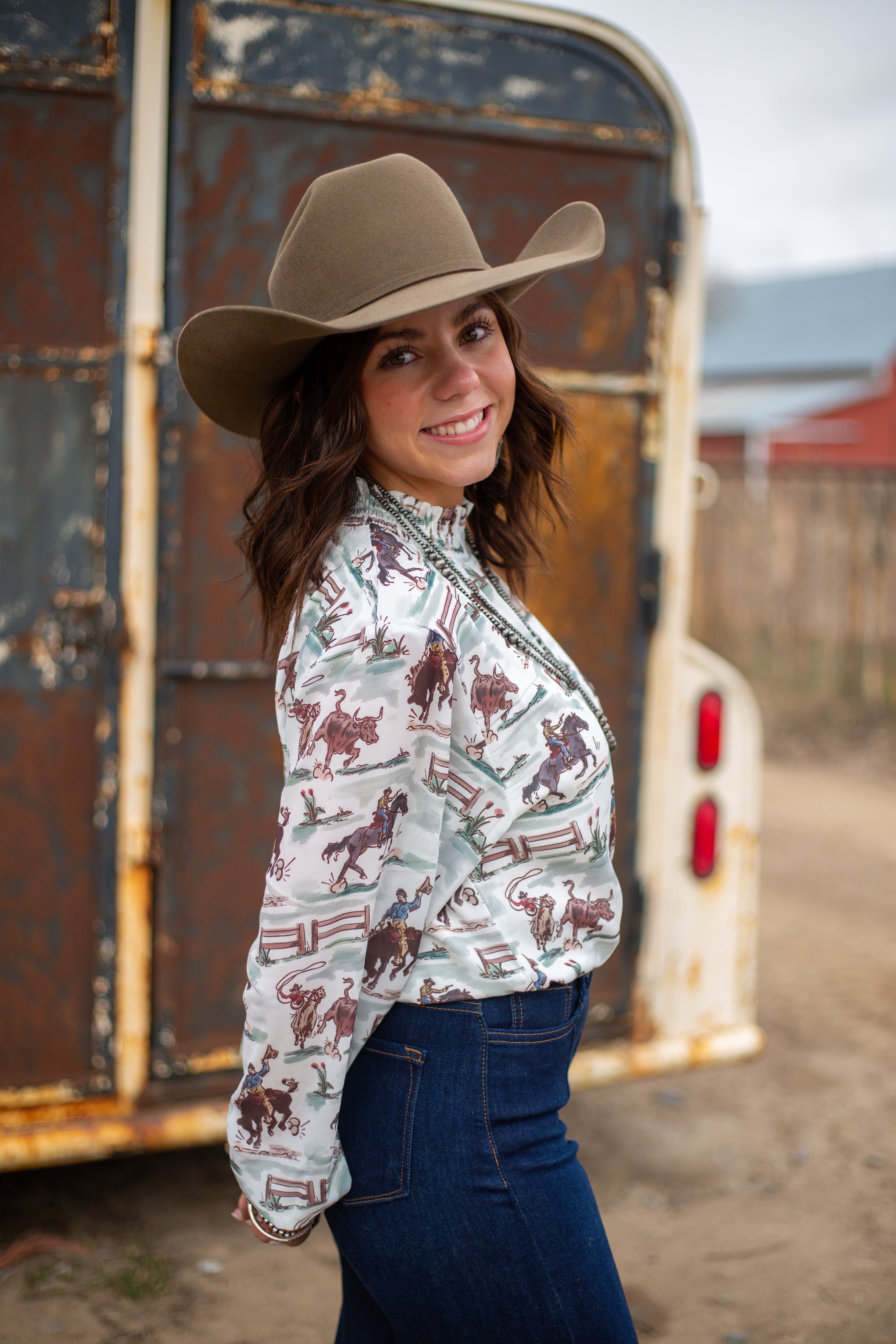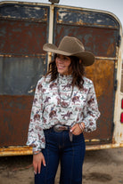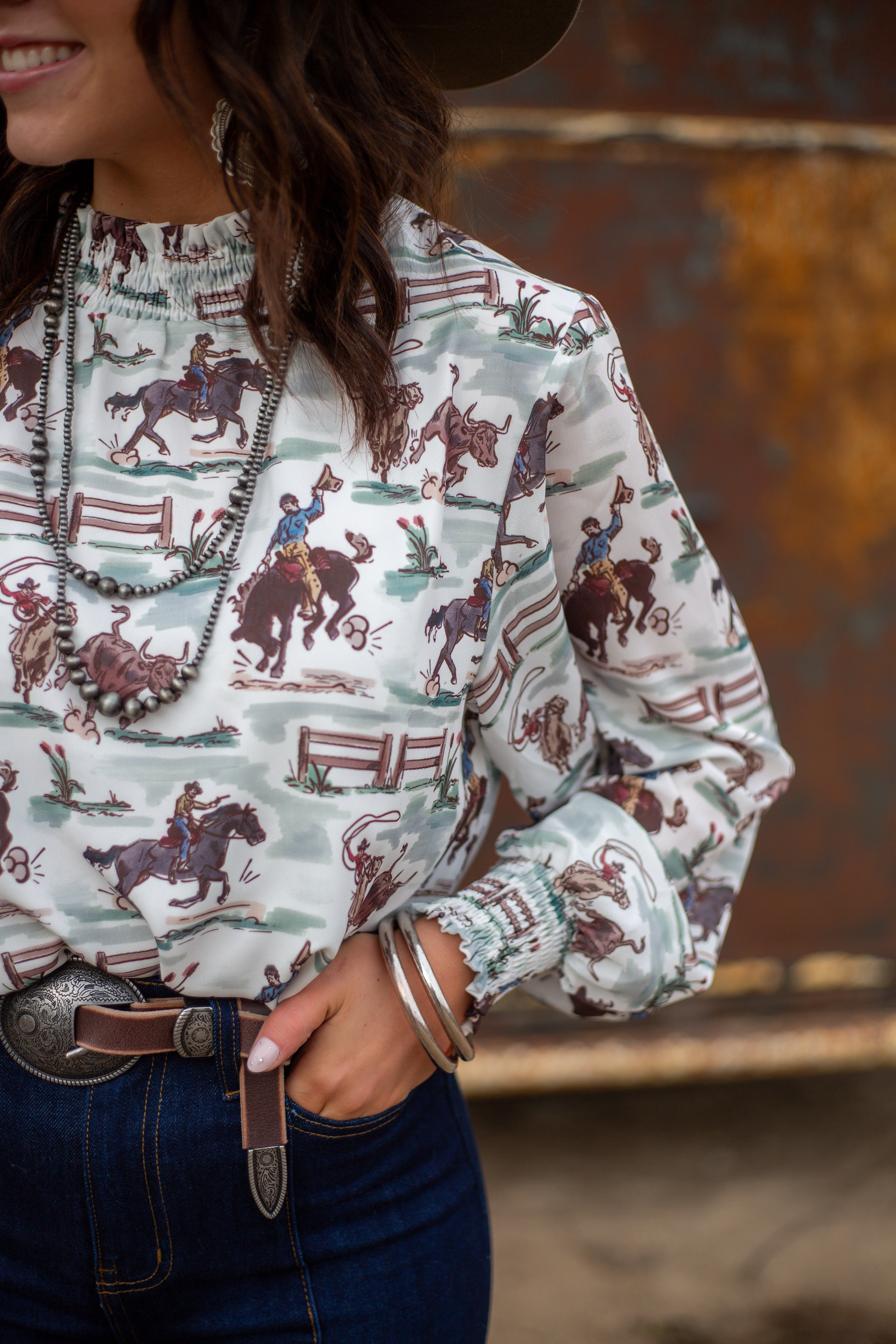 Pair the Ole’ West Cowboys Mock Neck Blouse with dark denim, a statement belt, and boots for a rodeo-ready look. Layer it under a vest or blazer for an elevated western outfit with vintage flair.