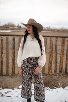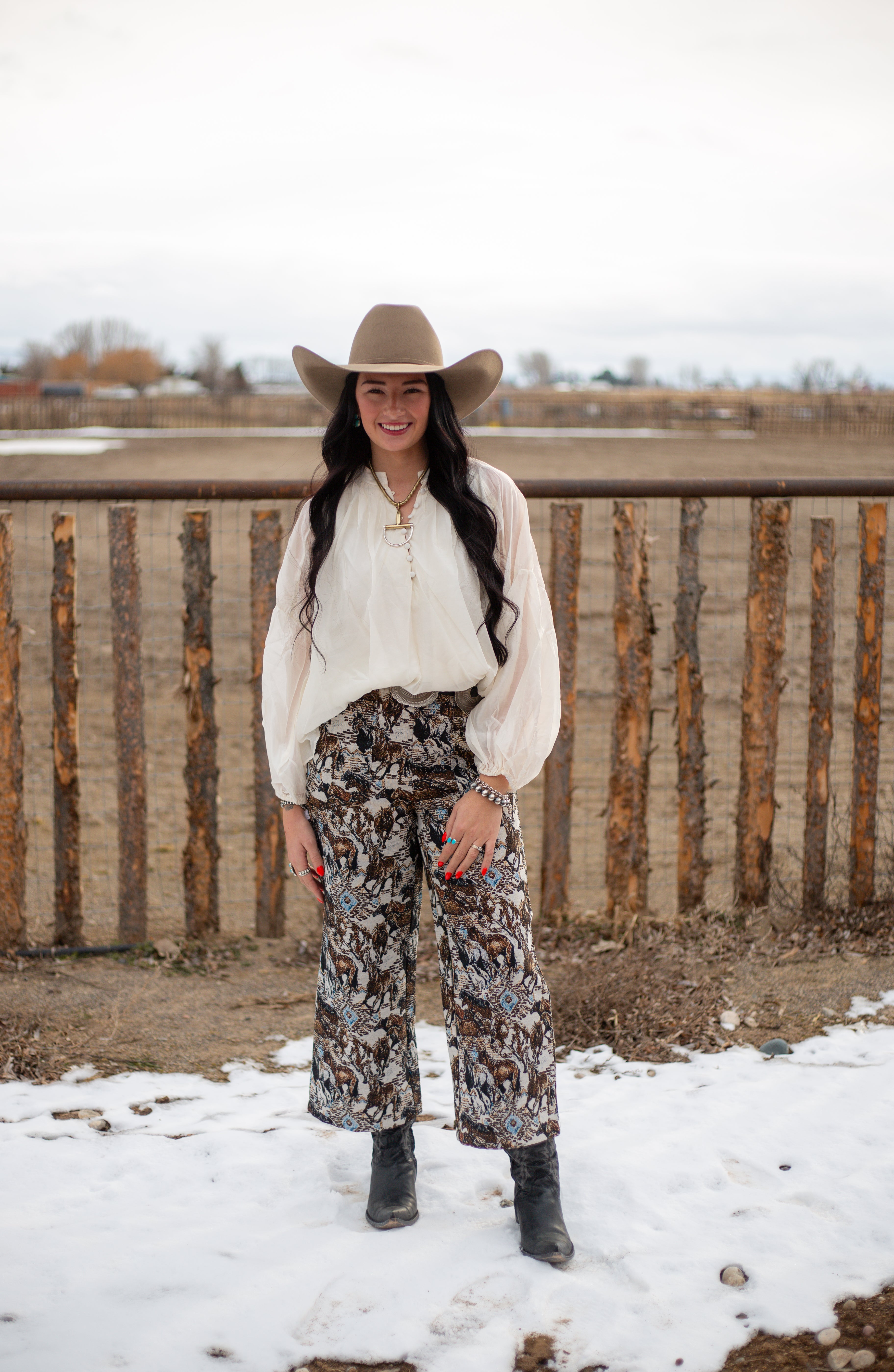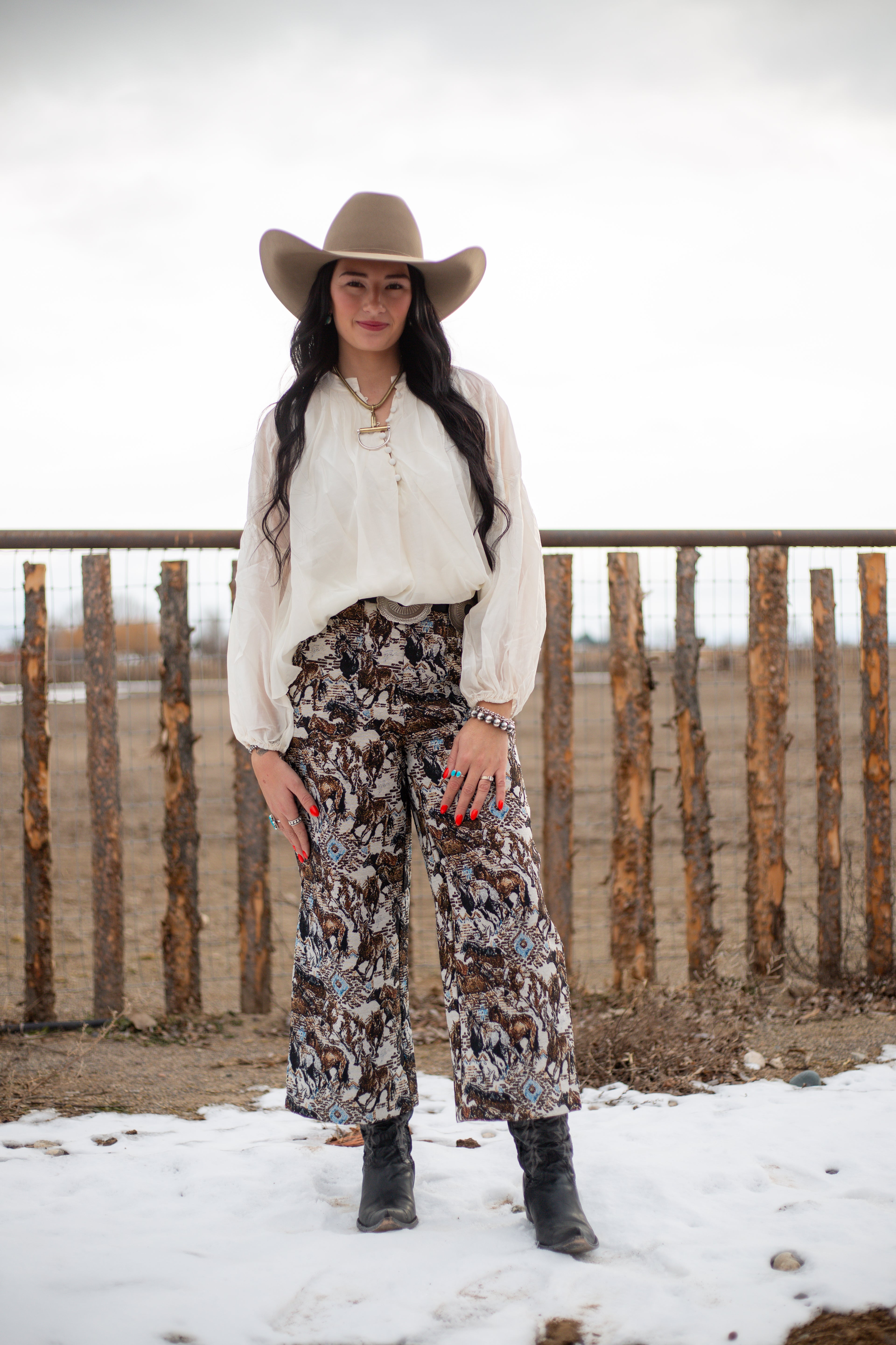 Bold, western-inspired, and effortlessly statement-making — the Horse On The Run Pants bring movement and character to your everyday style. Crafted from a thick woven fabric with a rich jacquard texture, these pants feature a cream base adorned with galloping horse motifs in warm brown, black, and rust tones, accented by subtle blue Southwestern diamond details. The high-rise waist and straight-to-wide leg silhouette create a flattering, comfortable fit that pairs beautifully with both fitted tops and flowy blouses.