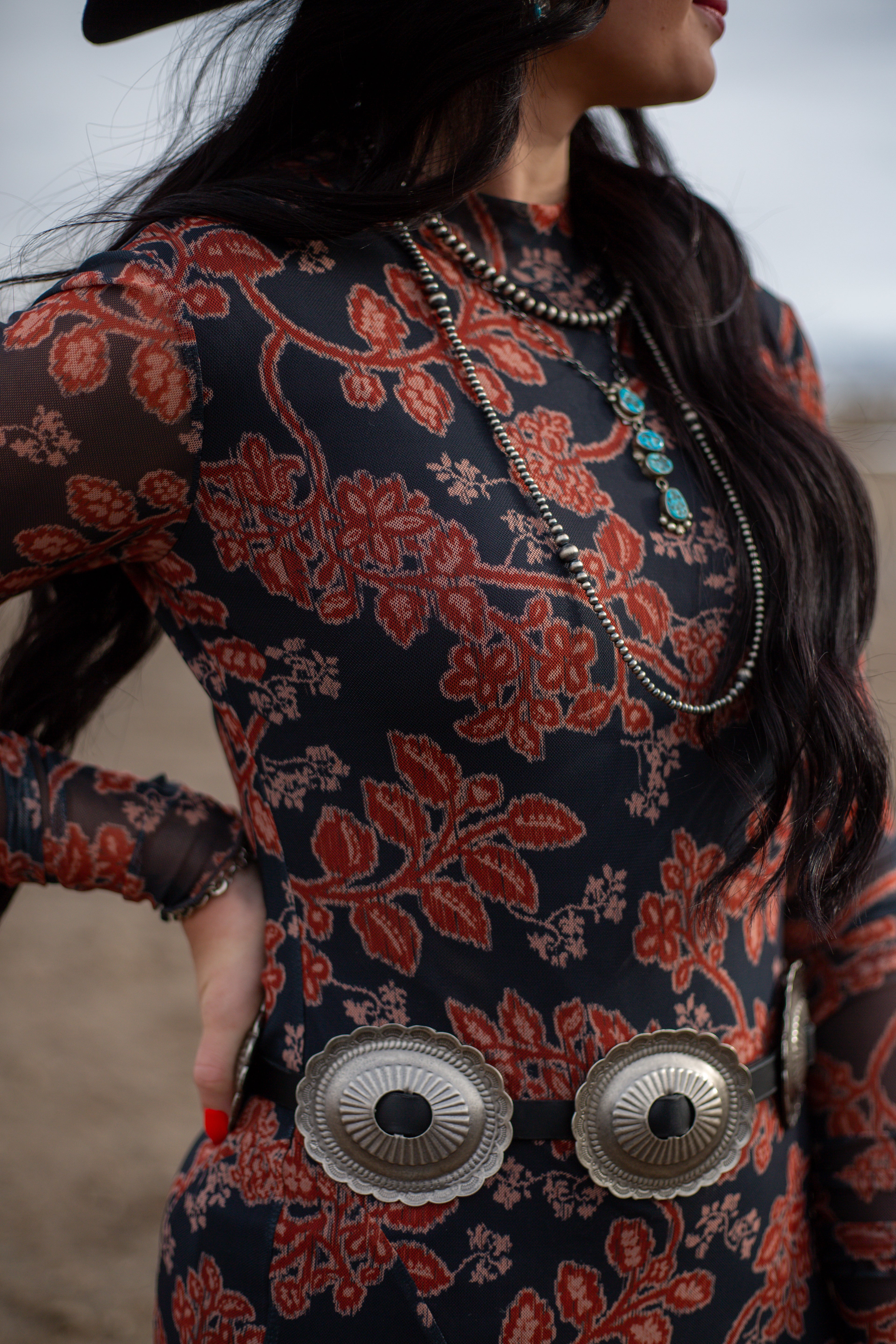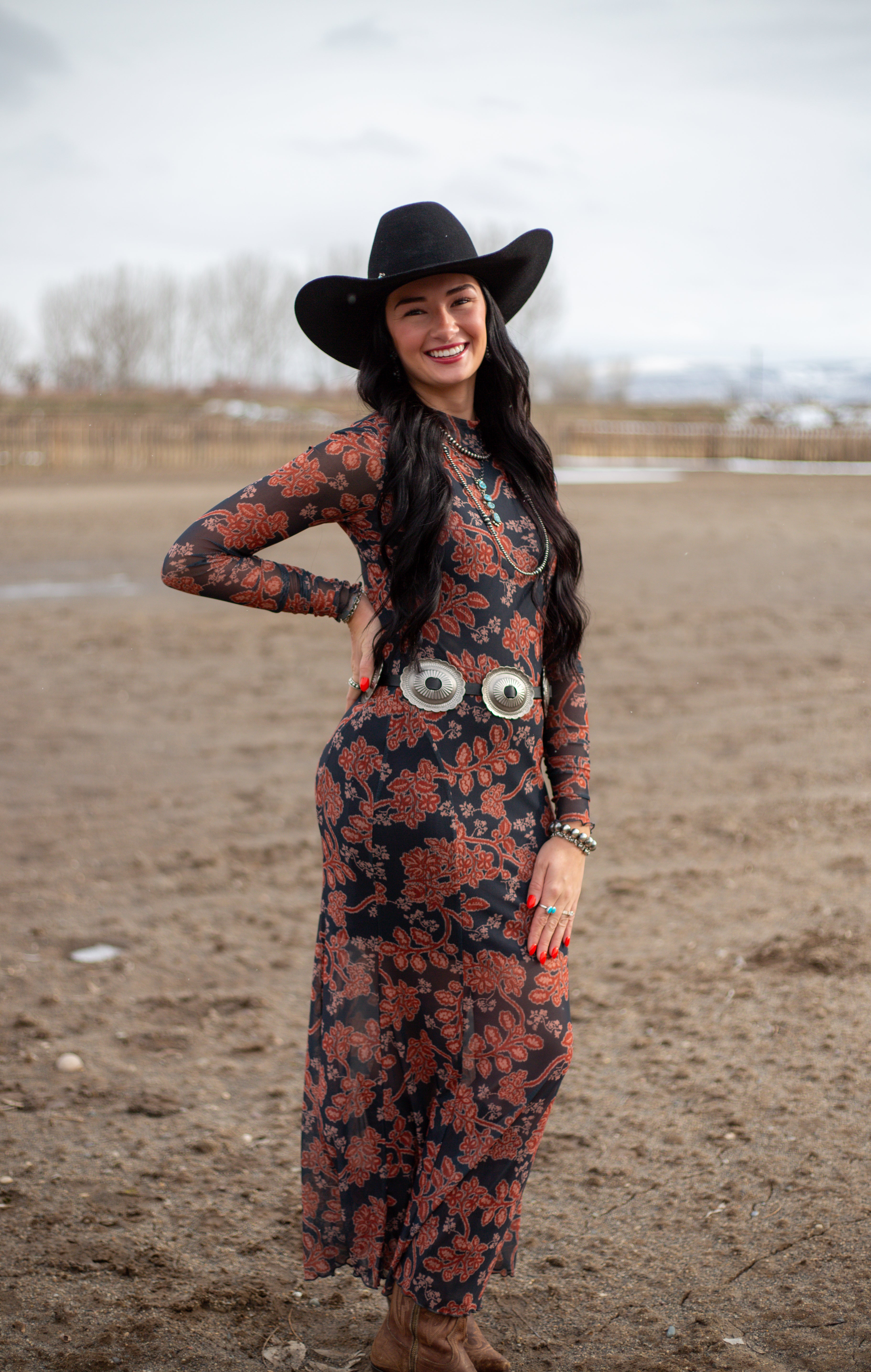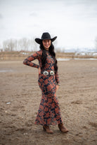 Romantic with a bold, western-inspired edge, The Veronica Maxi Dress is designed to make a statement. Crafted from ornate floral-print mesh, this ankle-length silhouette features a flattering fitted shape that moves beautifully with you. A mock neckline and long sleeves with thumbhole cuffs add a modern touch, while delicate lettuce-edge detailing at the cuffs and hem enhances its feminine charm. Finished with a subtle keyhole back and button closure, this dress is fully lined with a sleeveless, thigh-length lining for comfortable coverage without sacrificing style.
