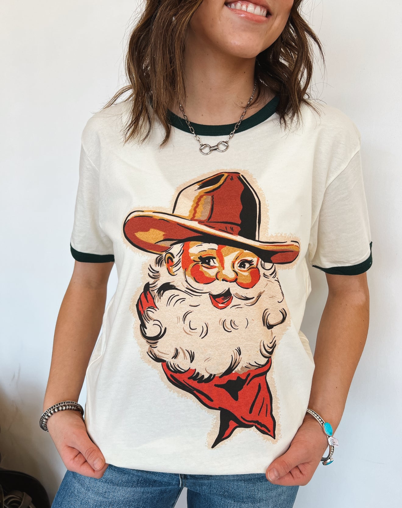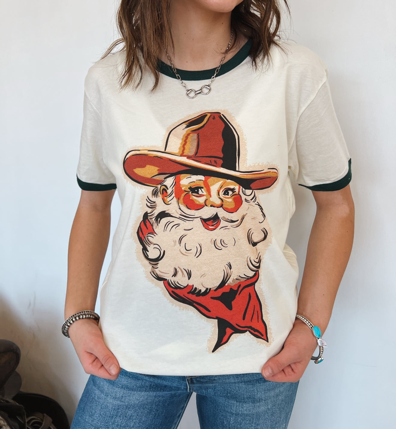Give your holiday wardrobe a Western twist with our Cowboy Santa Ringer Tee! Featuring a vintage-inspired cowboy Santa graphic printed on a soft cream ringer tee with deep green trim, this festive top is perfect for ranch days, Christmas gatherings, and everything in between. Style it with denim, concho belts, and turquoise for the cutest Western Christmas look.