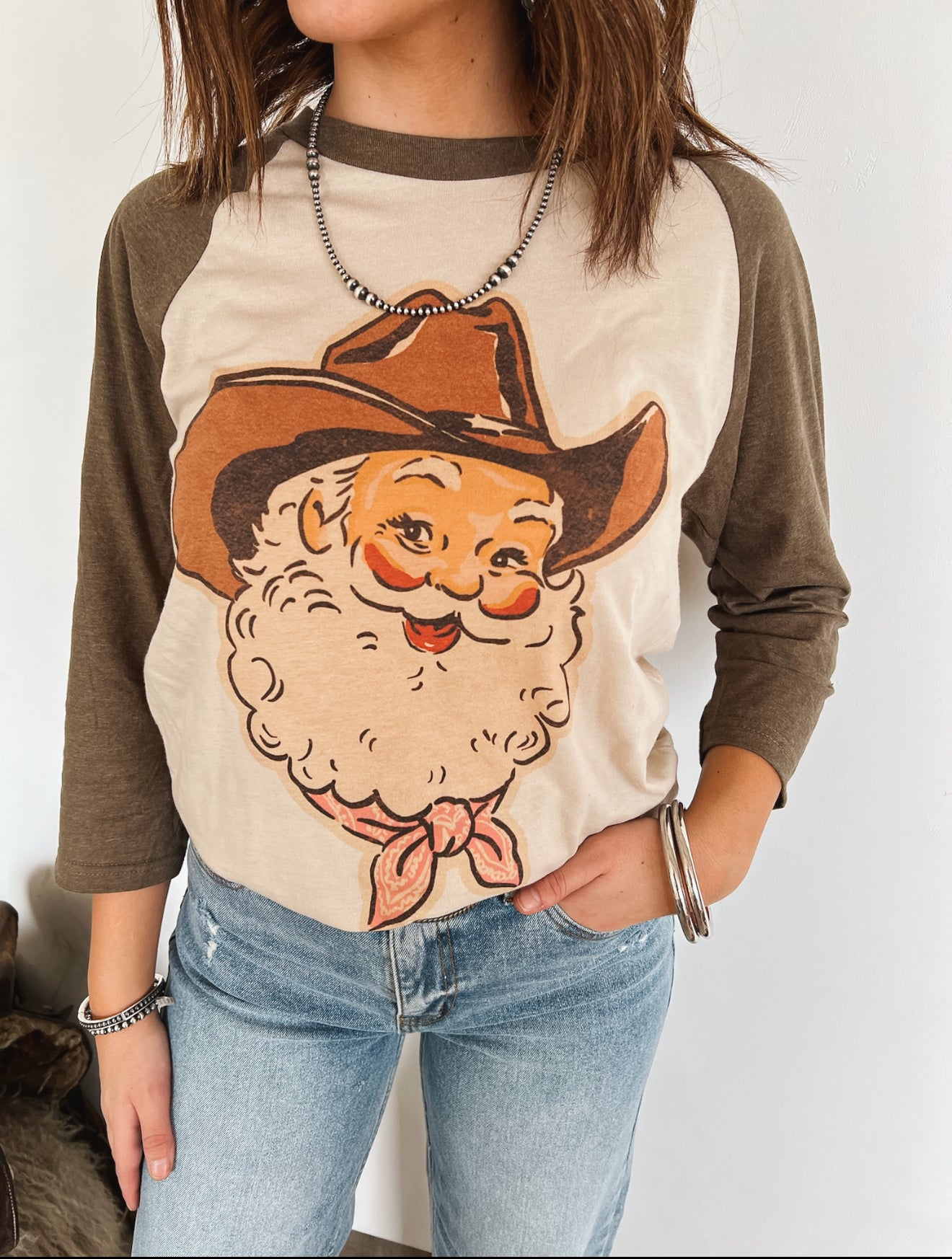 Cowboy Santa Vintage Raglan Tee — Brown Sleeves
