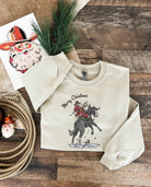 Right on time for Christmas — our Nick of Time design brings a Western spin to the season’s favorite cowboy, Santa himself! Printed on cream tones, this cozy tee or sweatshirt is the perfect mix of rustic charm and holiday cheer.