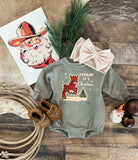 Your little one will be rodeo-ready for the holidays in our Christmas Reindeer Bubble Romper! Featuring a festive reindeer design printed on green tones, this cozy bubble romper brings the perfect mix of Western Christmas charm and everyday comfort — ideal for photos, parties, and holiday fun.