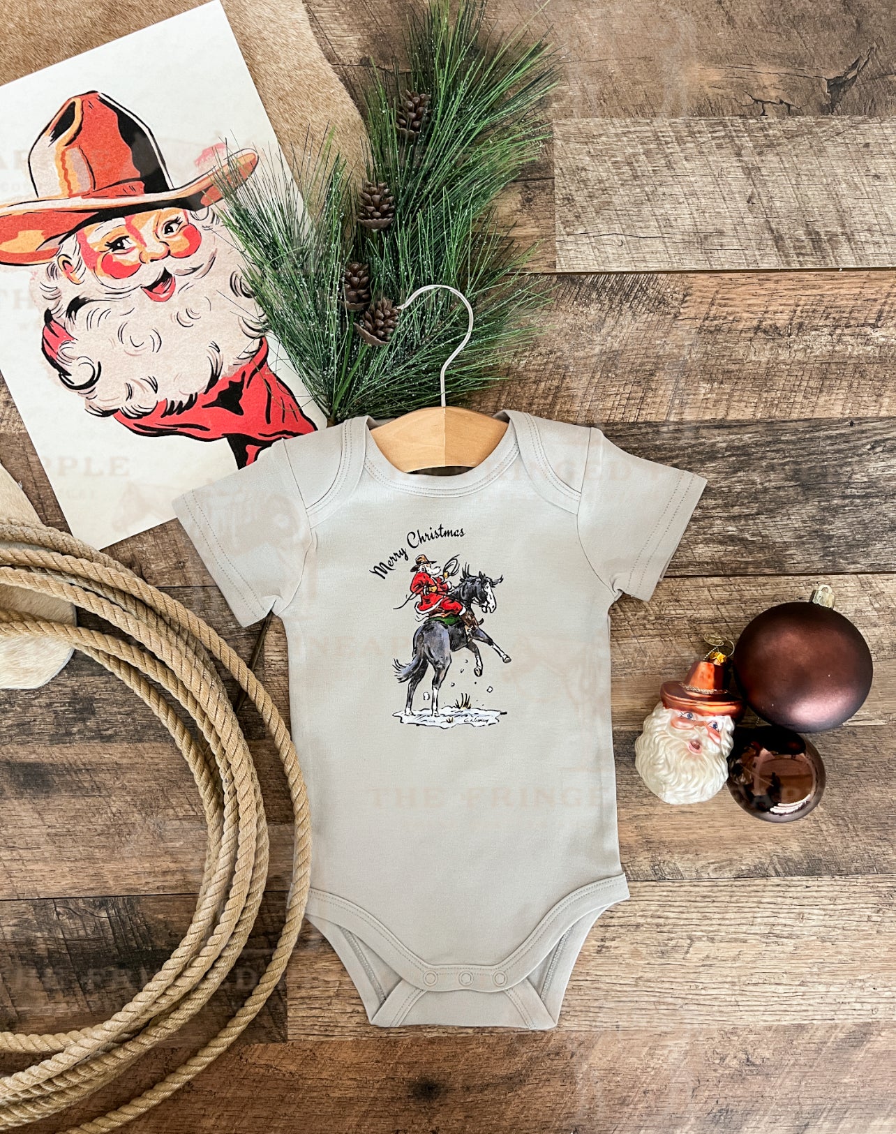 Your little cowboy or cowgirl will be right on time for Christmas in our Nick of Time design! Featuring a festive Western Santa, this cozy set brings all the ranch-side holiday cheer for pictures, family gatherings, and every day of the season.