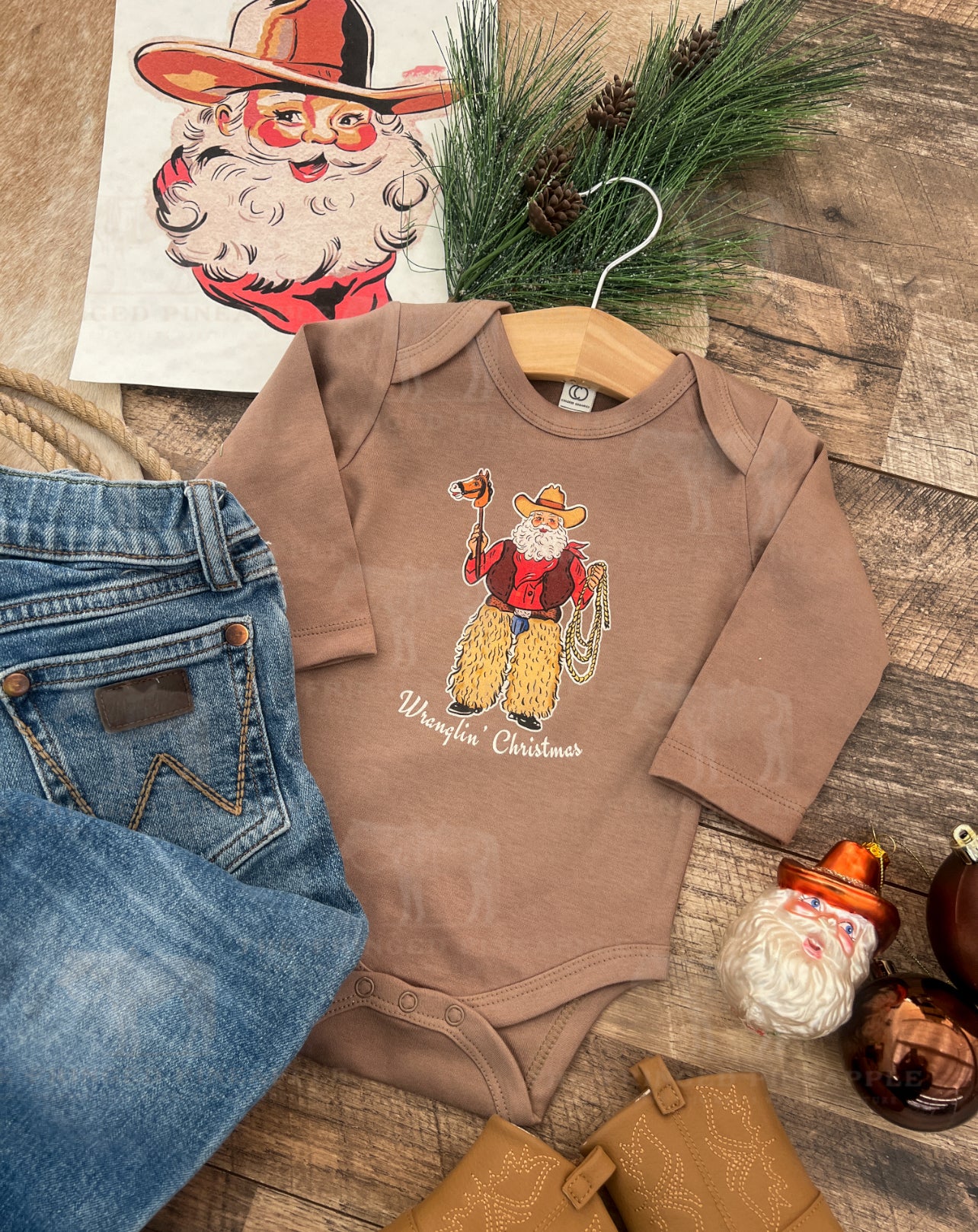Wranglin’ Christmas Long Sleeve Onesie & Tee (Truffle / Brown)