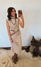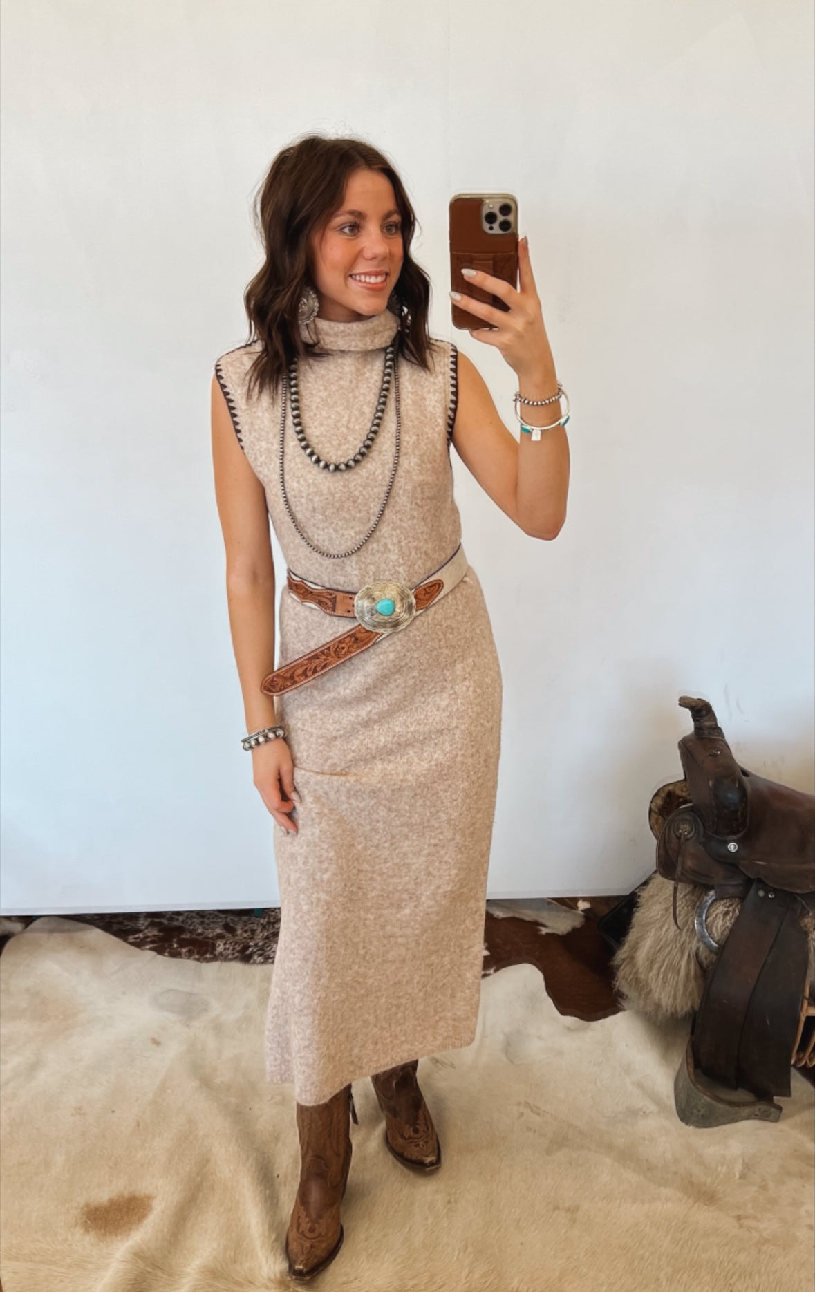 A sleek, elevated essential for fall and winter styling. This sleeveless knit maxi dress features a cozy turtleneck, contouring bodycon silhouette, and subtle stitch detailing that adds texture without overwhelming the clean, modern design. Crafted from a soft, stretchy blended knit, it skims the body comfortably while offering warmth and structure. Perfect on its own or layered under jackets, dusters, and oversized sweaters for a chic seasonal look.