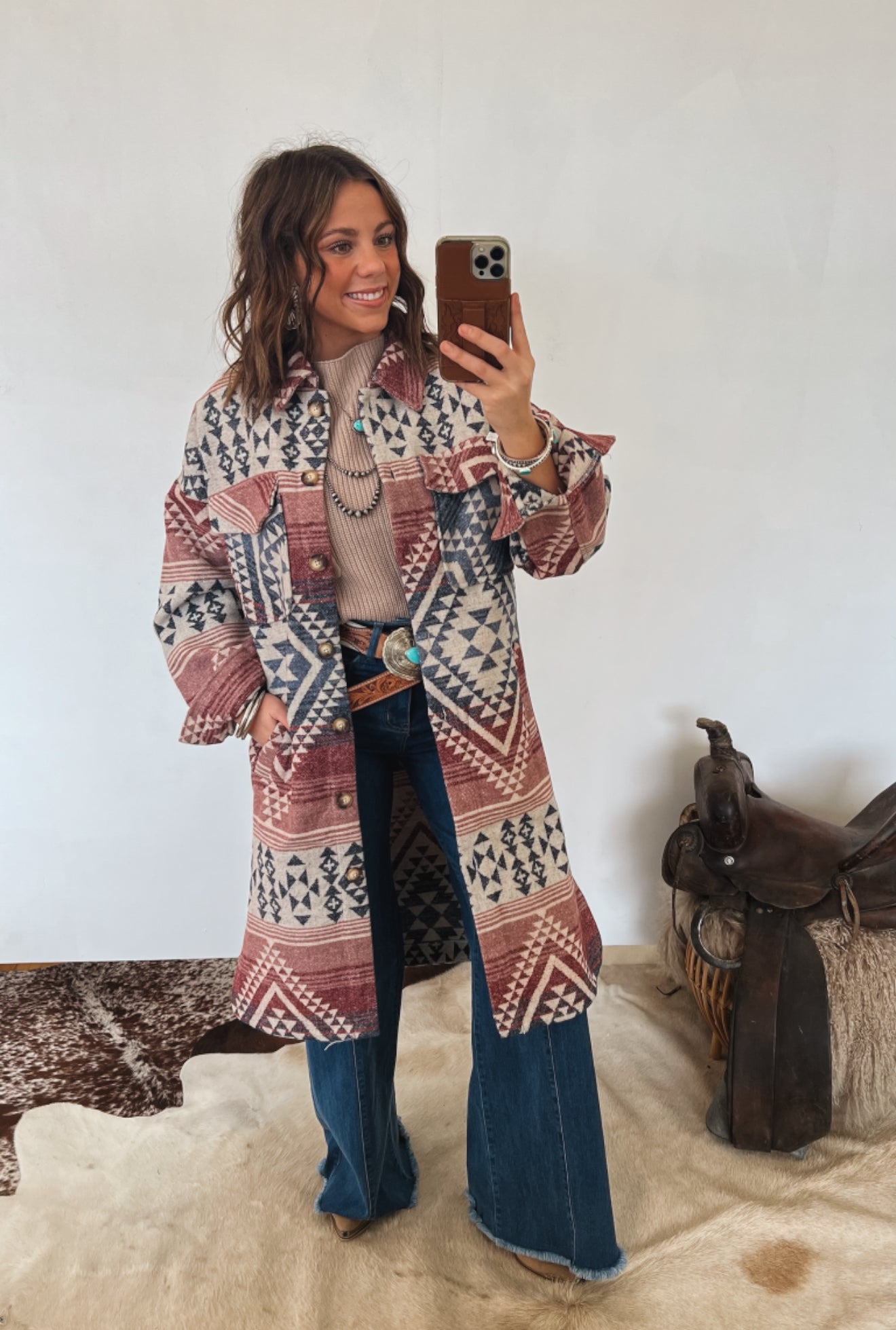 Make a bold statement with the Aztec Queen Jacket Coat, where western flair meets cozy comfort. This longline coat features a striking Aztec-inspired print in rich neutral tones, perfect for layering through the cooler seasons. Designed with a button-front closure, chest pockets, and a relaxed silhouette, it brings both warmth and effortless style to any outfit.