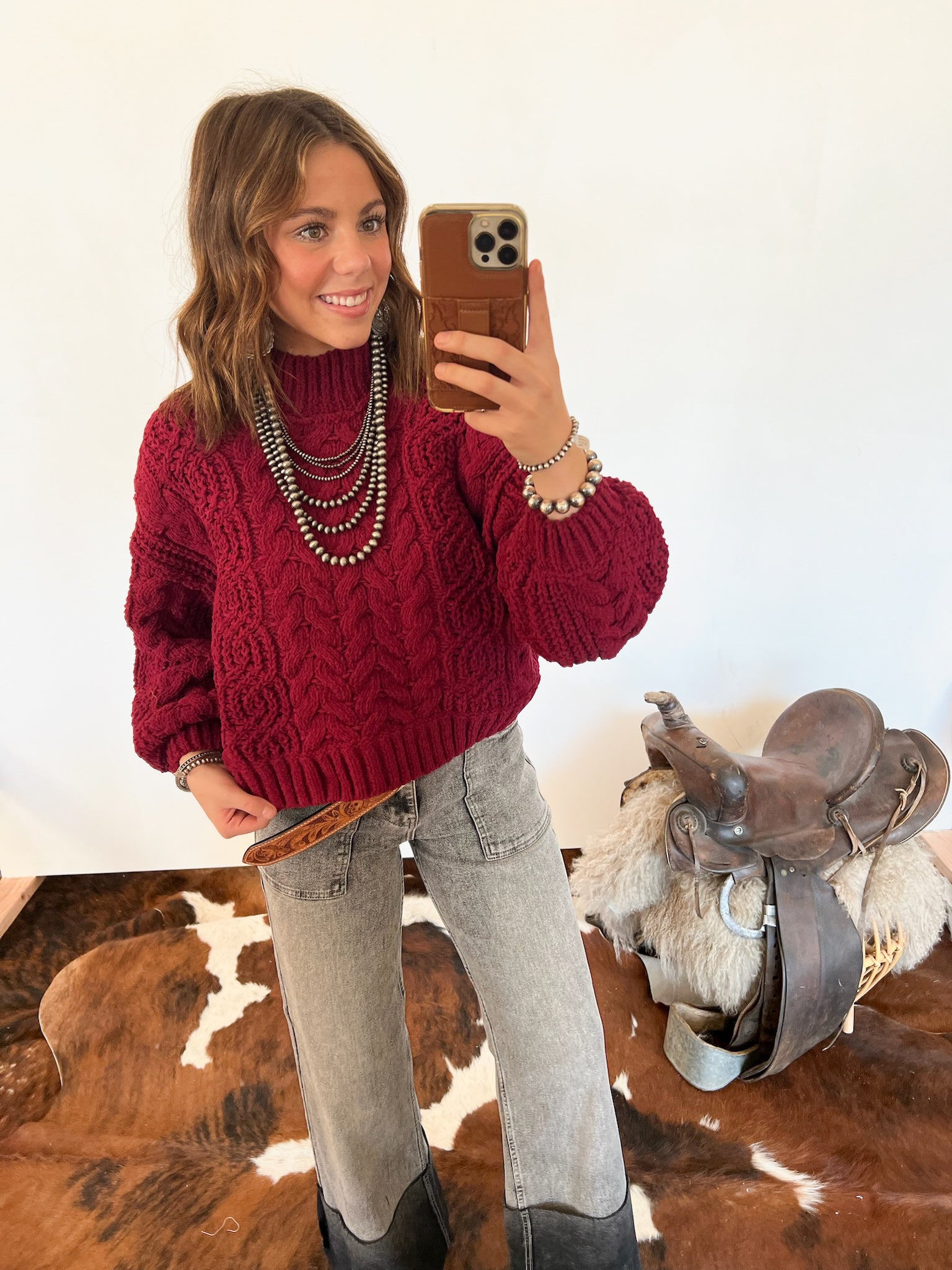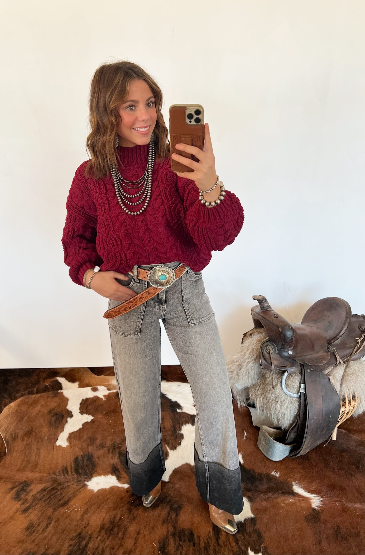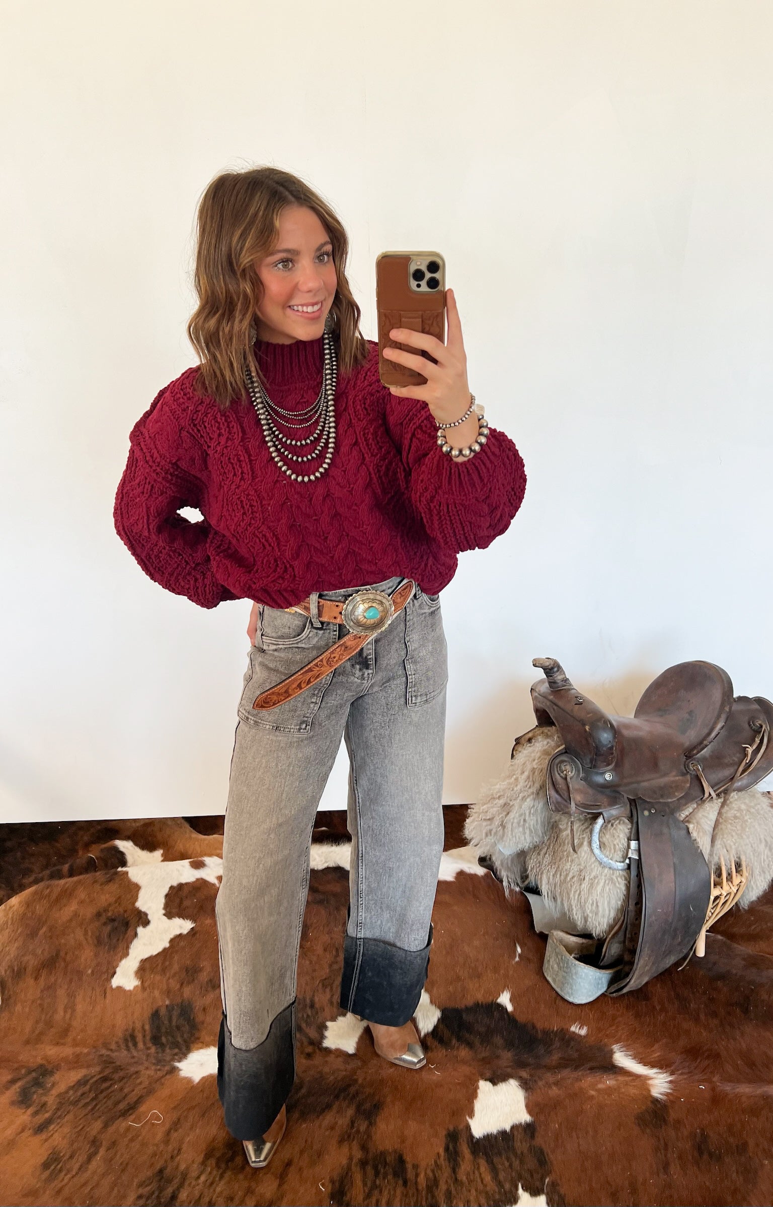 Pair it with high-waisted denim and a statement belt for an effortless western vibe, or layer it over a dress with boots for a cozy ranch-chic look.