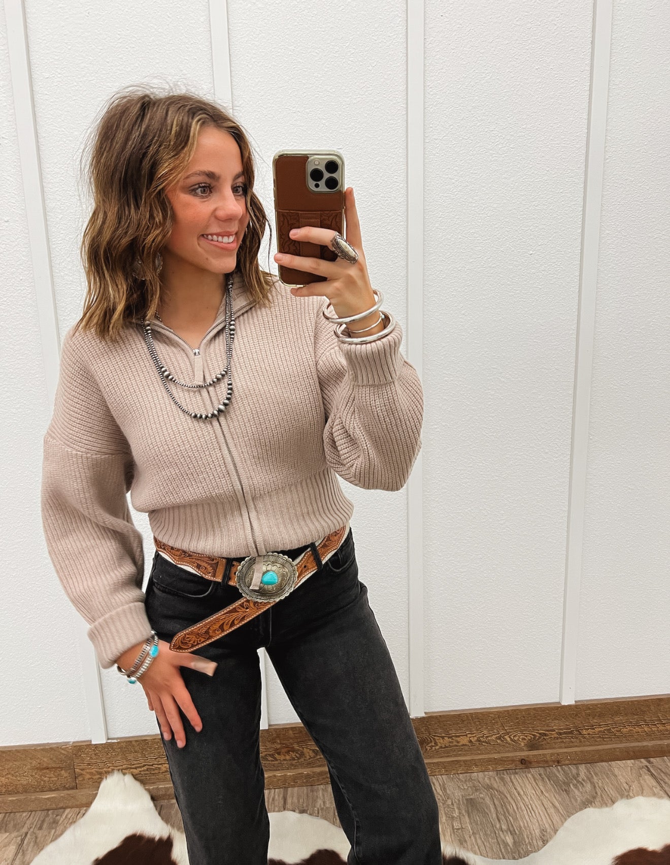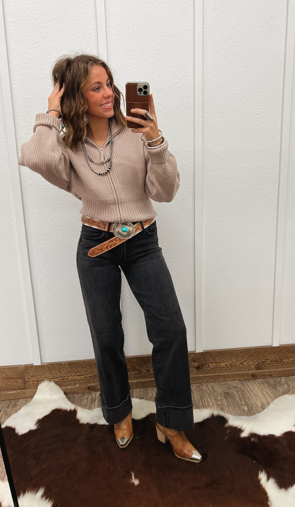 The Collared Zip-Up Sweater is where cozy meets cool with a touch of modern western edge. Featuring a ribbed knit texture, chic collar, and functional two-way zipper, it’s the perfect blend of comfort and versatility. Dress it up or down, this sweater is a closet essential you’ll keep reaching for.