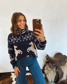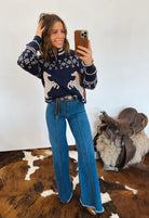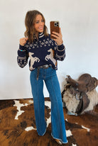 The Half Zip Sweater delivers cozy warmth with a bold western spirit. Designed in a rich navy knit, it features rearing horse graphics on the front paired with a snowflake-inspired pattern along the sleeves and chest. The striped ribbed collar, cuffs, and hem give it a sporty edge, while the half-zip neckline makes it versatile for layering.