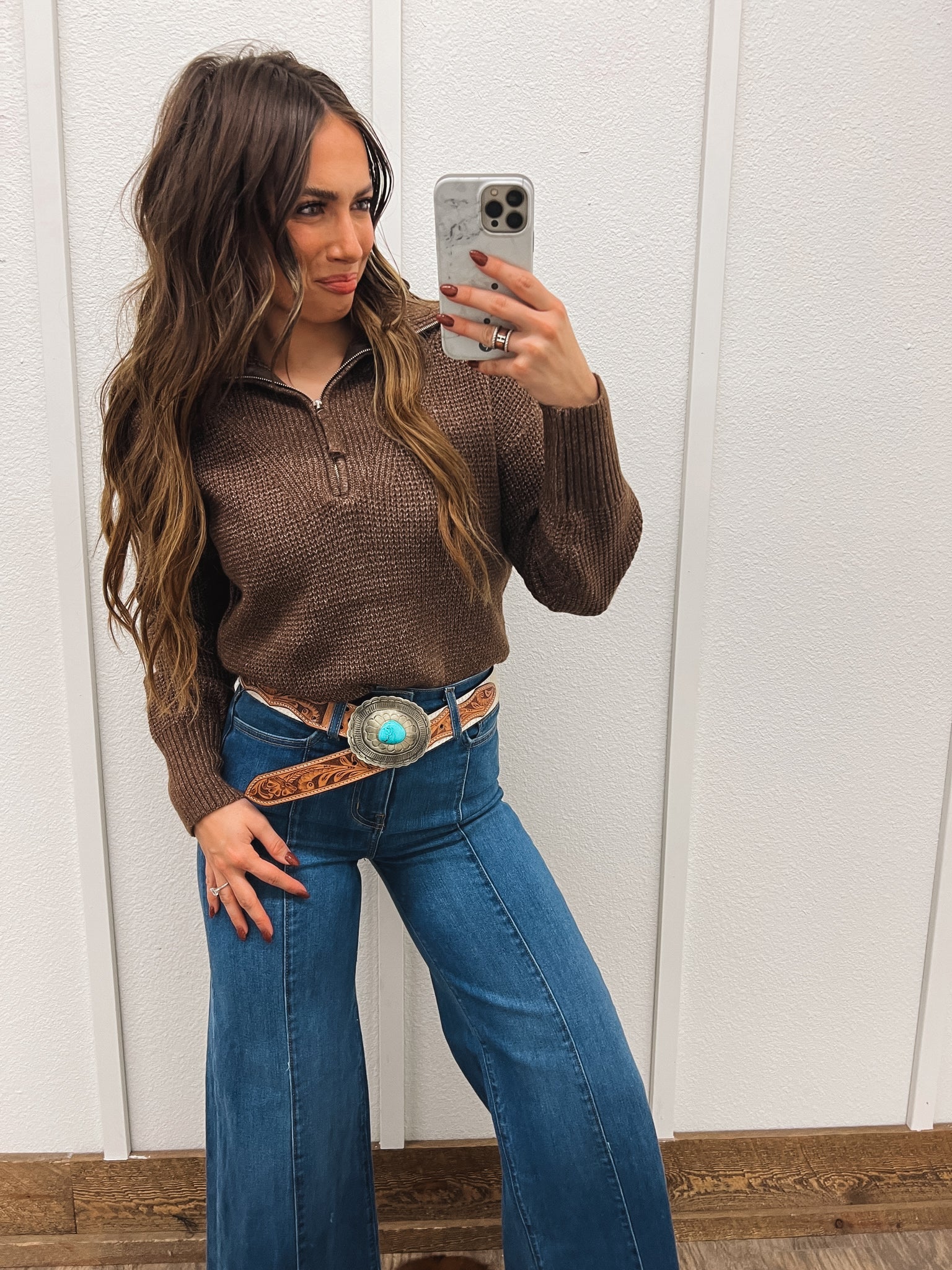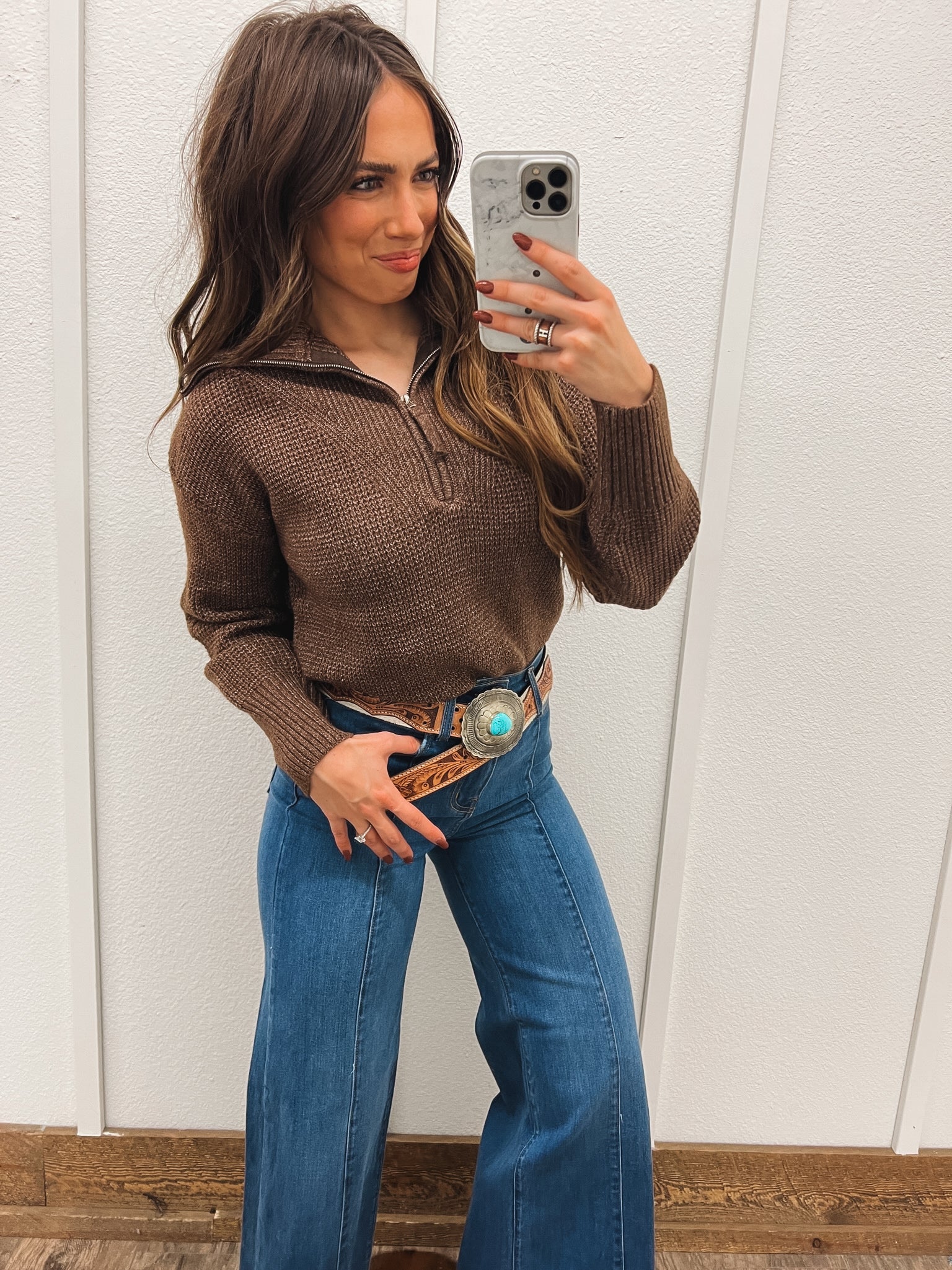 Stay warm and stylish in our Western-inspired Half Zip Pullover Sweater. The rich brown color and half zip design make it a versatile piece for any occasion.