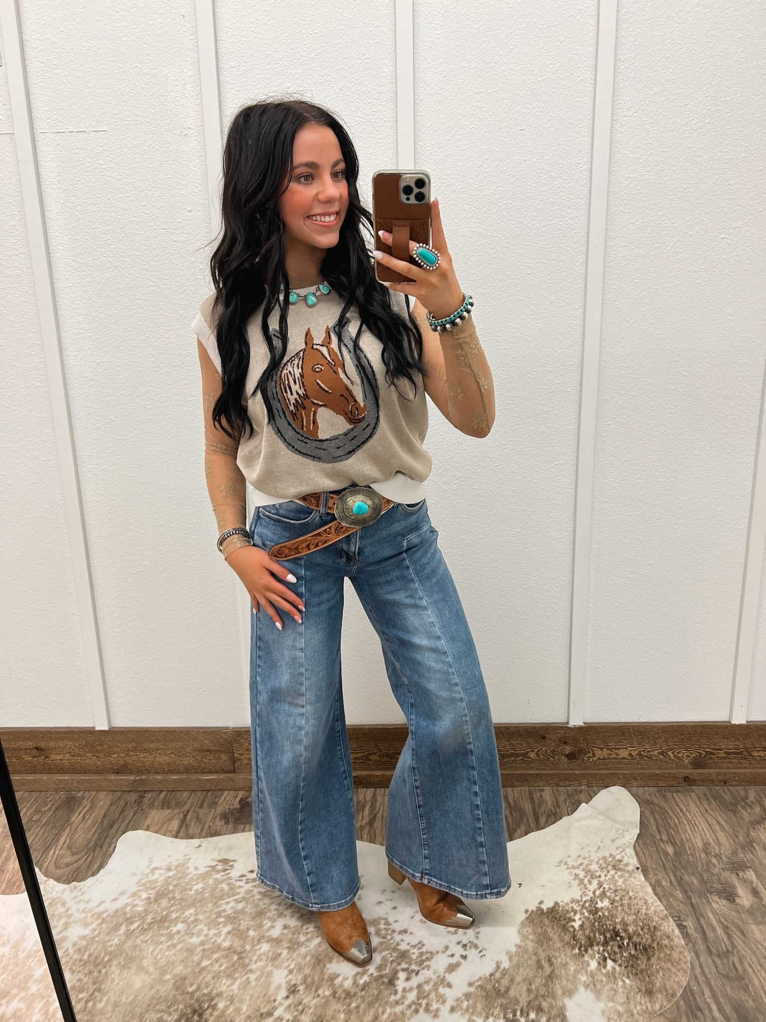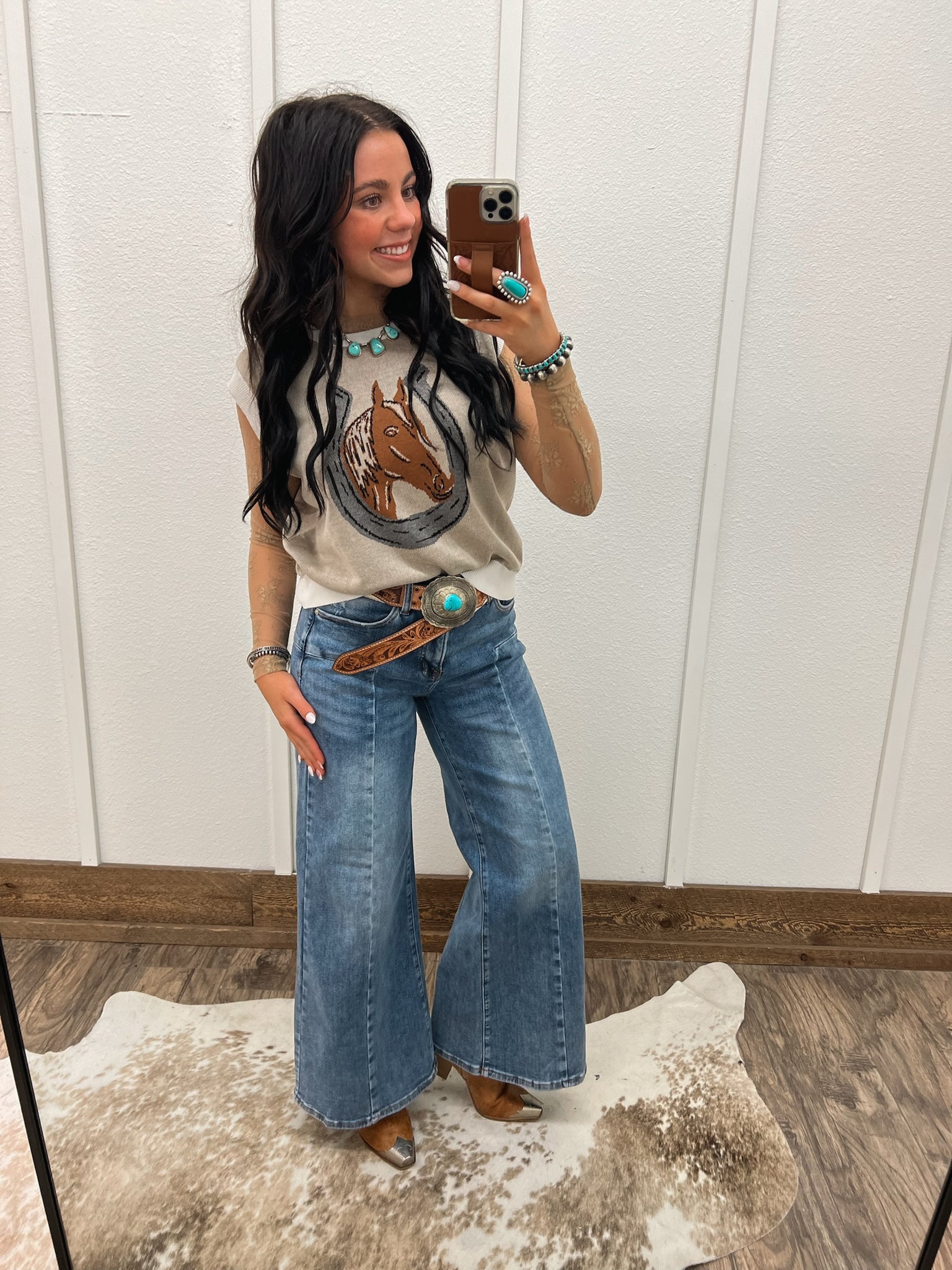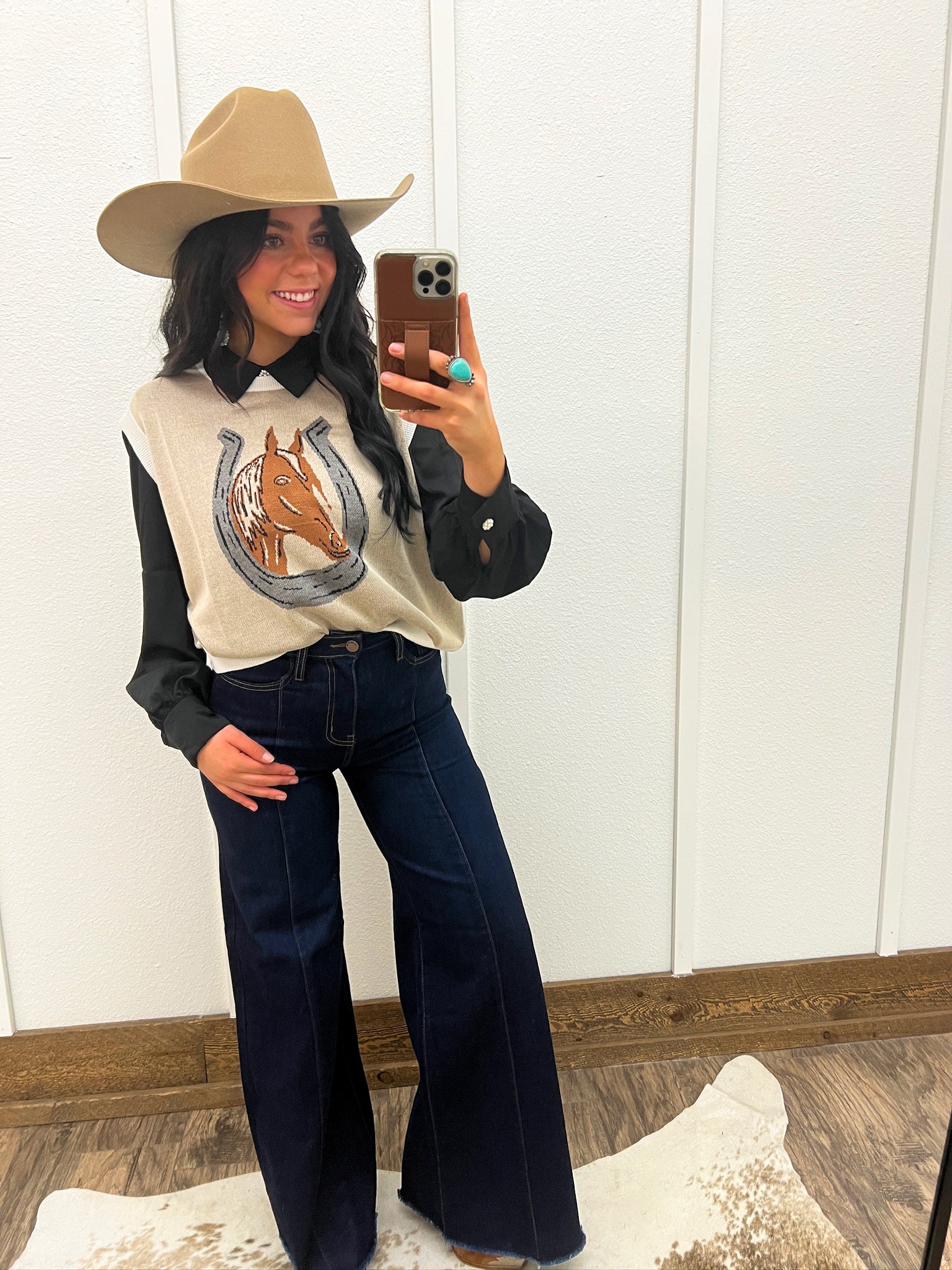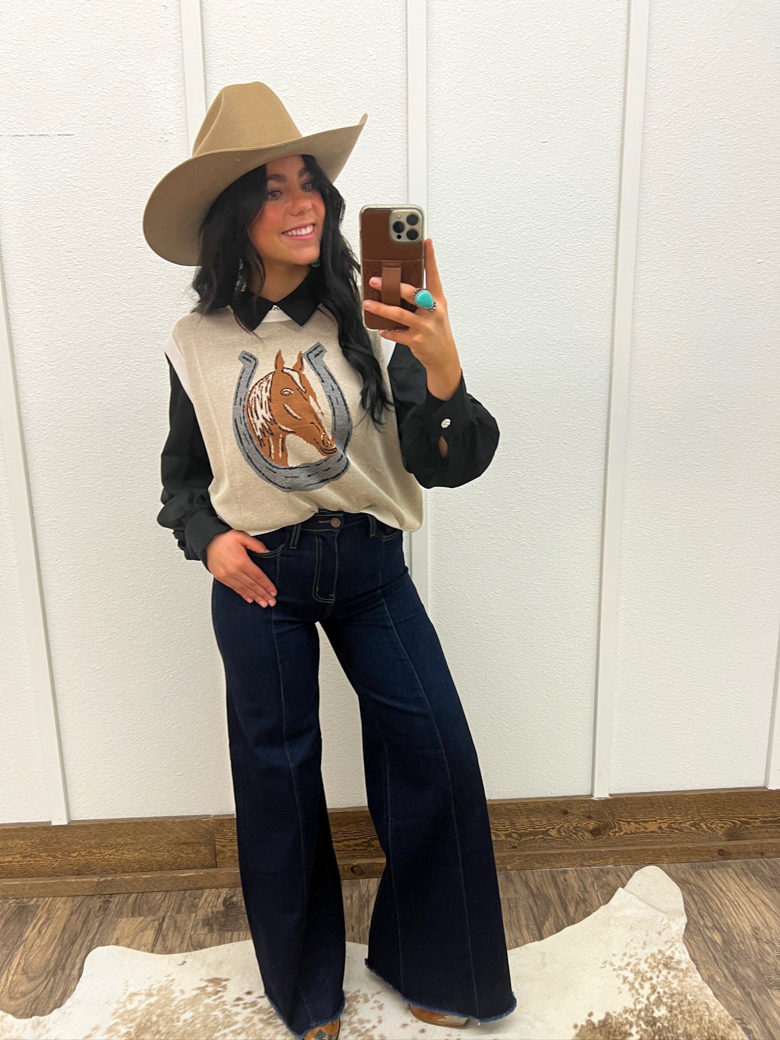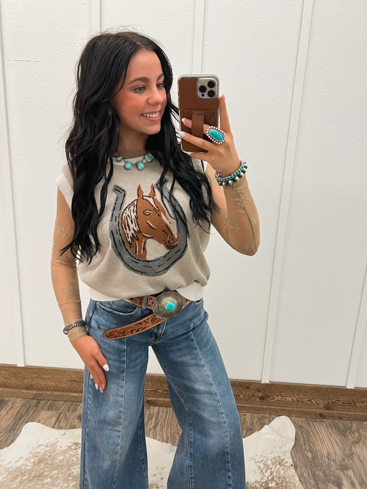 Ride into comfort and style with our Horseshoe Sweater Vest. Made with high-quality material and a unique design, this vest will keep you looking fashionable. Perfect for any western enthusiast, add a touch of cowboy charm to your wardrobe.