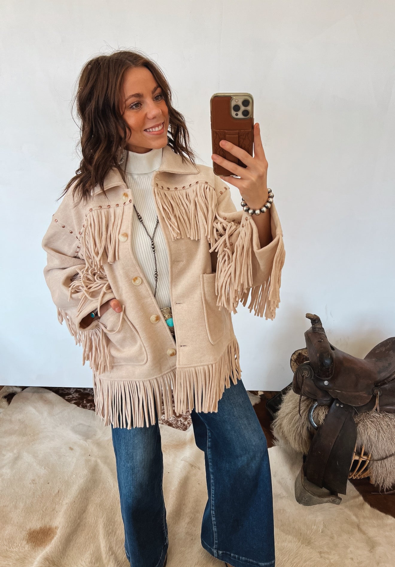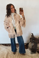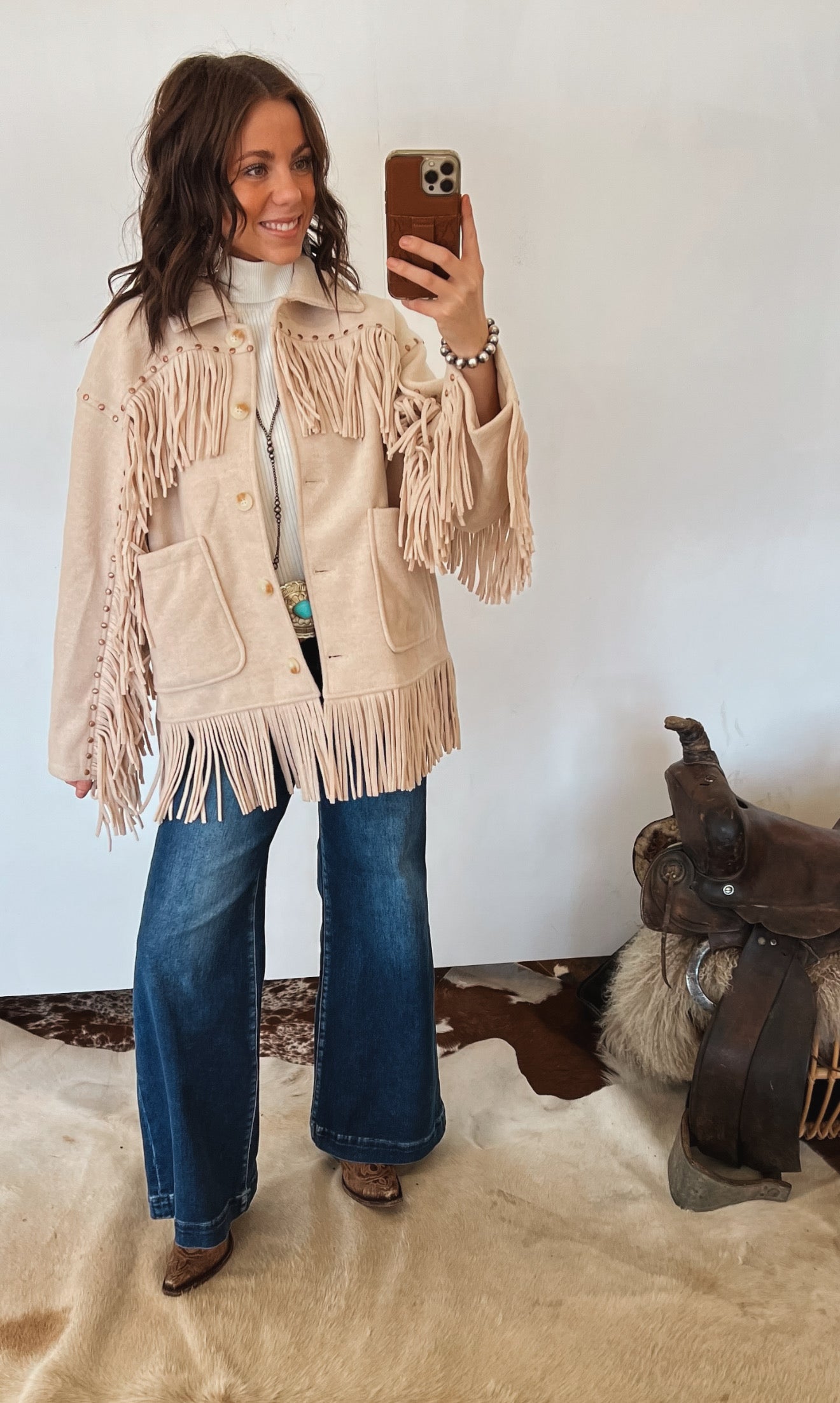 Turn heads wherever you go in the Little Miss FRINGE Jacket — a statement layering piece full of western charm and playful movement. Designed in a soft cream tone, this jacket features dramatic long fringe cascading across the chest, sleeves, and hem, accented with subtle gold stud detailing for the perfect touch of shine. A classic button-up front and oversized patch pockets keep the look grounded and wearable, while the fringe adds eye-catching texture with every step.