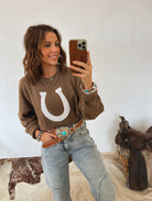 Bring a little luck everywhere you roam with the Luck Of The Cowboy Sweater in rich, earthy brown. Designed with an ultra-soft blend that feels cozy without the weight, this relaxed-fit sweater features a bold white horseshoe graphic front and center. The roomy sleeves, easy drape, and comfy stretch make it ideal for everyday wear, whether you're styling it with denim for a casual day out or layering it under a jacket for cooler weather.