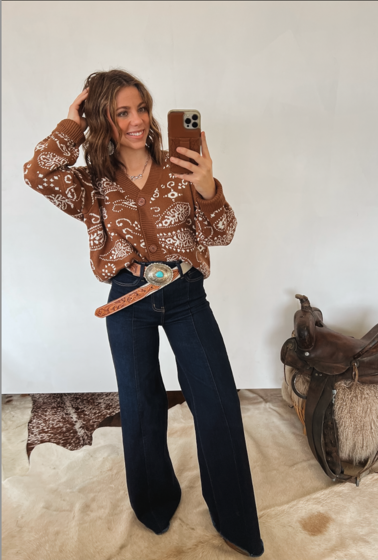 Add a touch of western charm to your wardrobe with the Paisley Knit Cardigan. This cozy, button-up knit features a beautiful paisley-inspired pattern that blends classic style with a modern twist. Designed with a relaxed fit and soft acrylic yarn, it’s perfect for layering over tanks, tees, or dresses — effortlessly transitioning from day to night. Whether you’re headed to brunch or the barn, this cardigan brings warmth and personality to every outfit.