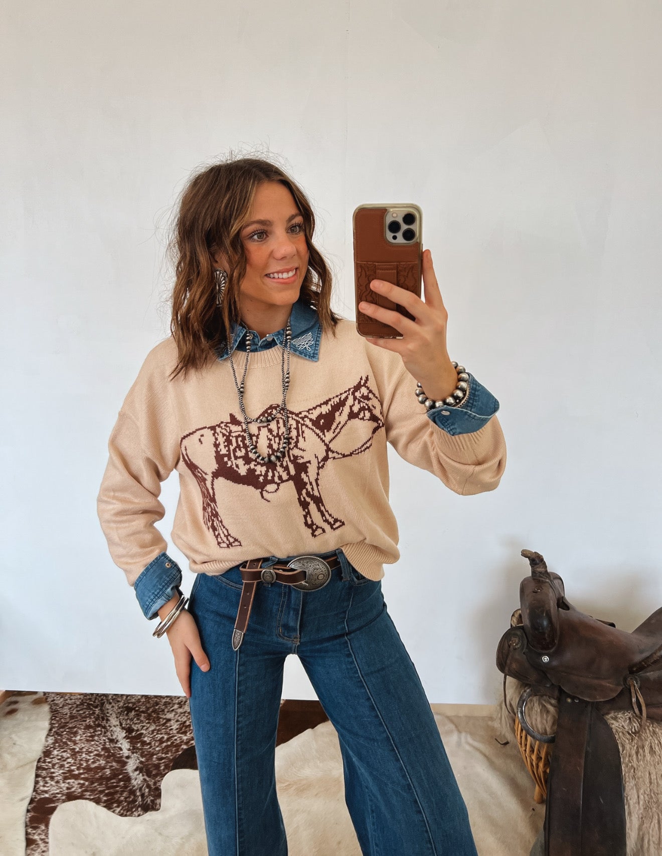 Western charm meets cozy, everyday style in the Saddle Up Horse Knit Sweater. With its soft knit feel and beautifully woven horse graphic across the front, this sweater brings a touch of ranch-side character to any outfit.