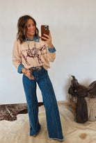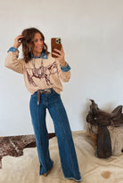 The warm, neutral tone pairs effortlessly with denim, while the detailed horse design adds that perfect hint of vintage Western flair. Lightweight yet cozy, it layers beautifully over a chambray shirt or stands alone for a relaxed, effortless look. Finished with ribbed cuffs and hem for a classic, easy fit.