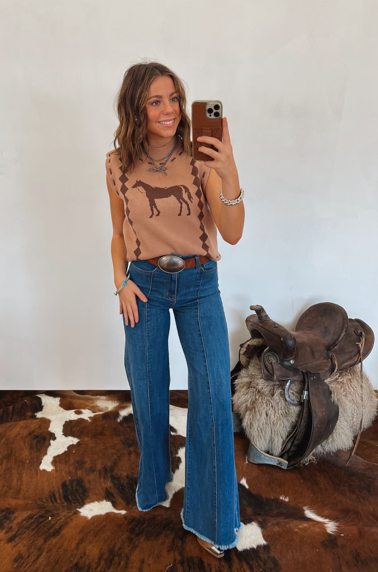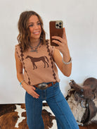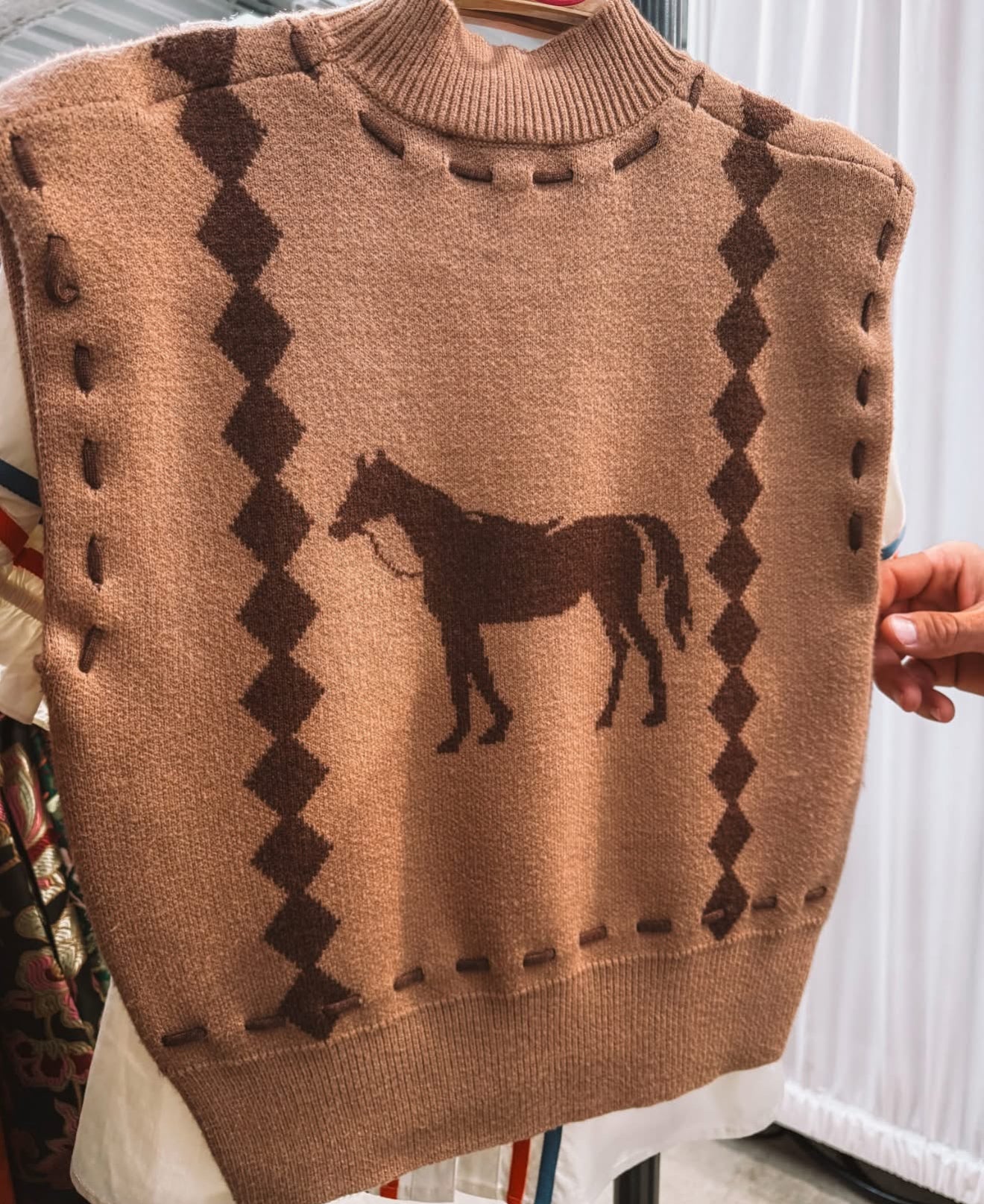 Elevate your western style with this cozy Knit Sweater Vest, designed with a bold horse motif and geometric side detailing. The soft, midweight knit feels comfortable while adding a touch of texture to any outfit. Its sleeveless silhouette makes it versatile for layering or wearing alone, making it a standout piece through every season.
