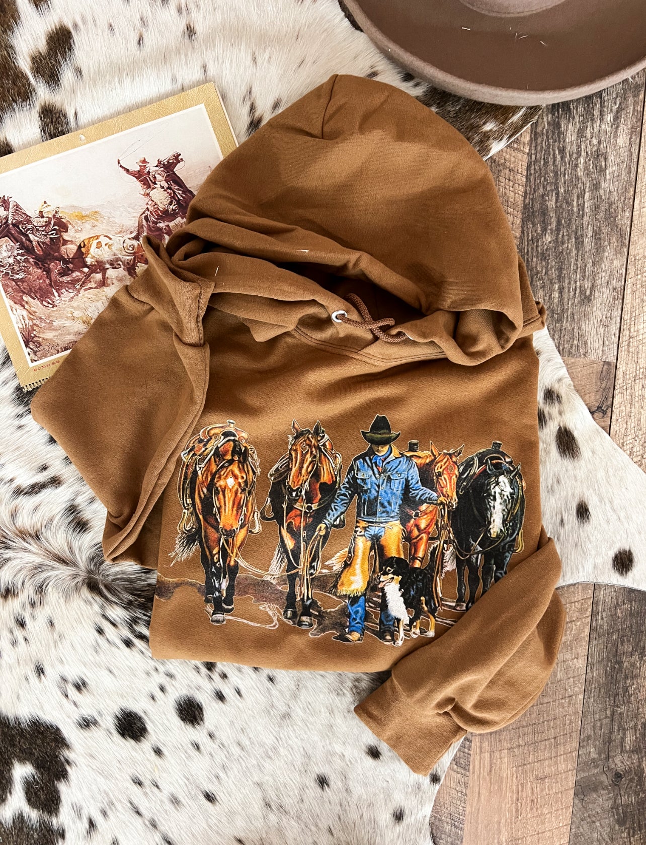 Leader of the pack Western Graphic Hoodie- A fun western fall graphic, to add a little western to your fall. Featuring fall floral highland graphic. For out western babes who love to dress in cute western graphics.Printed on a cognac brown hoodie.