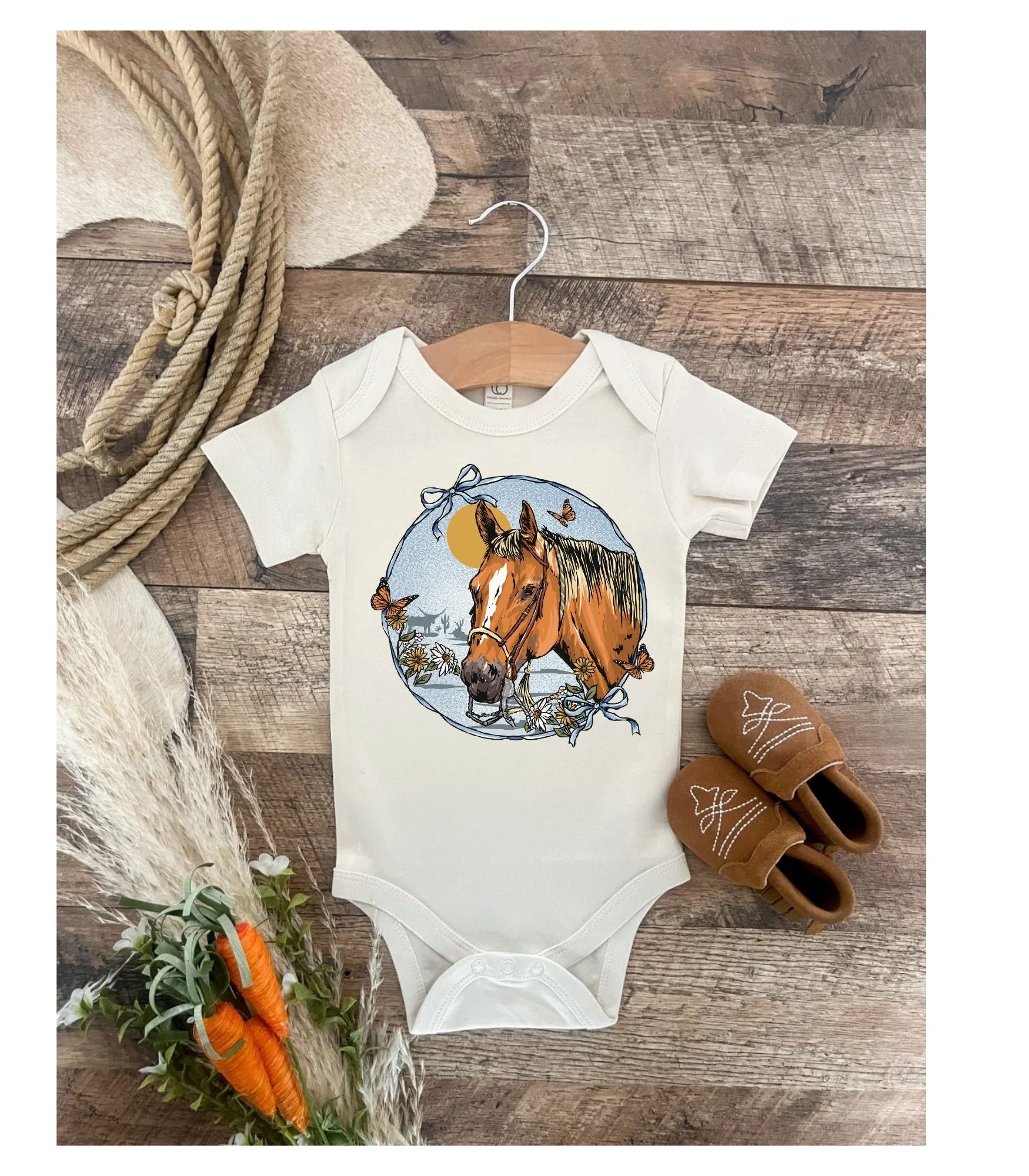 Available as both a short sleeve baby onesie and a toddler/youth graphic tee, this piece is designed for comfort while bringing a soft western feel to your little one’s spring wardrobe. The neutral cream tone pairs effortlessly with denim, boots, and your favorite western accessories.