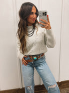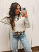 Stay warm and stylish with our Bootstitch Cozy Sweater in Cream. Made with high-quality materials and featuring a classic western-inspired design, this sweater is perfect for any outdoor adventure or cozy night by the fireplace.