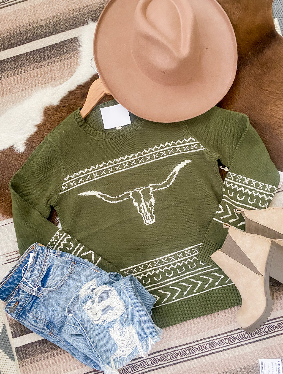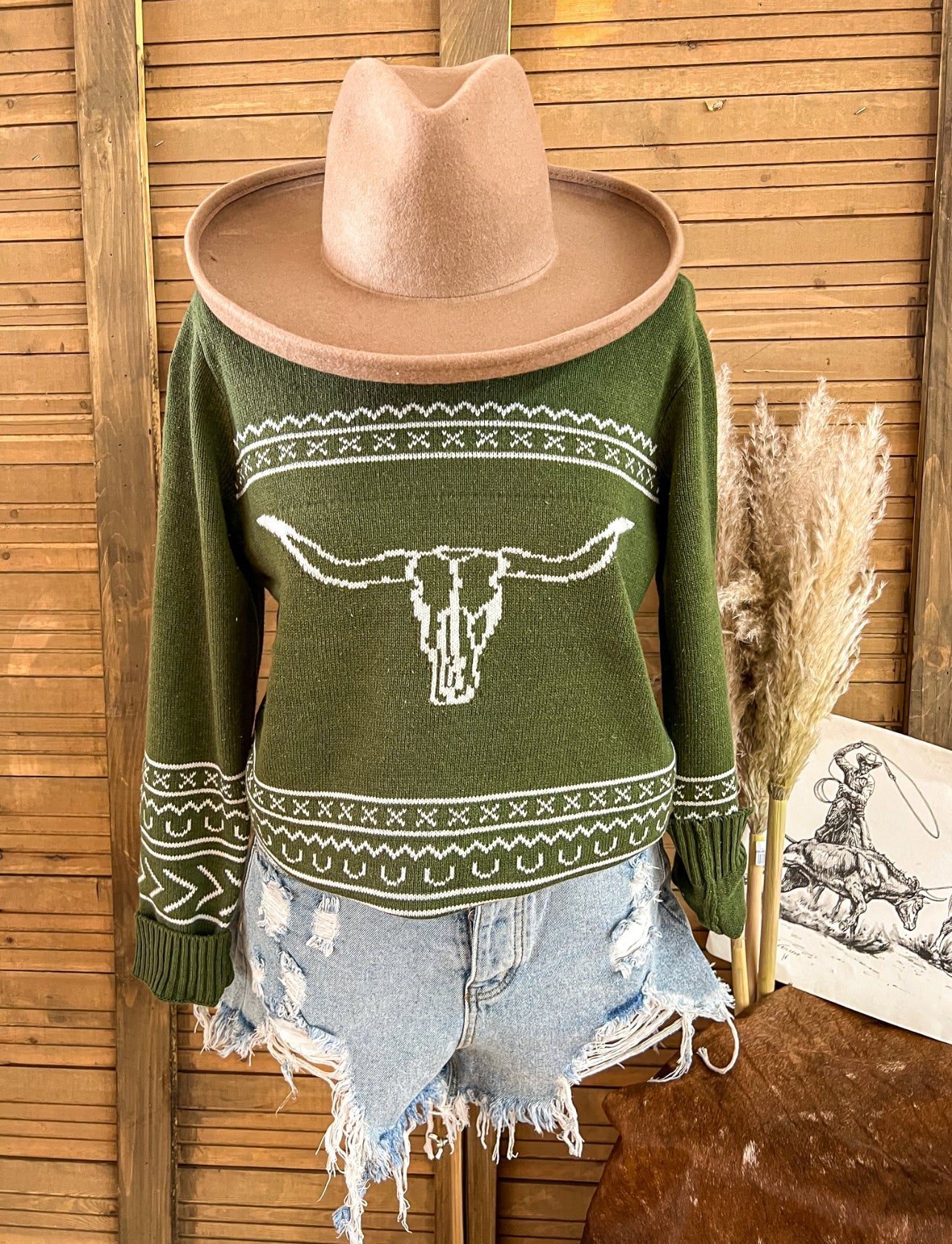 Out To Pasture-Longhorn Sweater(Olive) 2.0