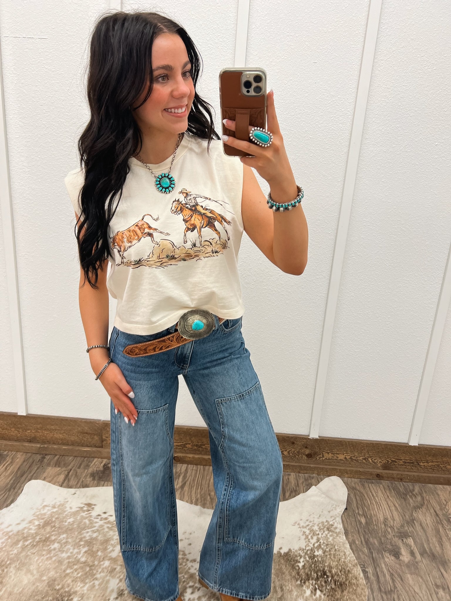 This isn’t your average tank. Crafted from a soft, midweight cotton blend, it’s built for movement and made to turn heads. The relaxed, slightly cropped flattering cut skims the body without clinging, and wide shoulder straps offer both comfort and edge. Bold western-style lettering across the chest brings that cowgirl confidence front and center. Whether you're stomping through city streets or kicking up dust at golden hour, this tank walks the walk.
