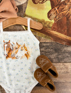 Western charm starts young! This adorable baby romper features a trio of watercolor horses on a soft floral print—perfect for your little cowgirl or cowboy. With sweet spaghetti straps, snap closures, and a lightweight cotton feel, it's made for comfort on the range (or nap time). Perfect for rodeo days, photo ops, or just looking cute on the ranch!