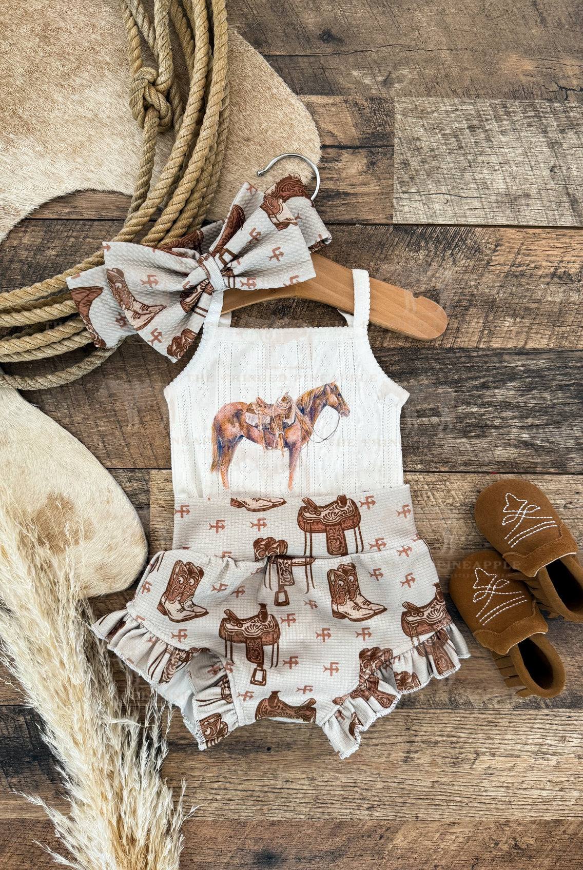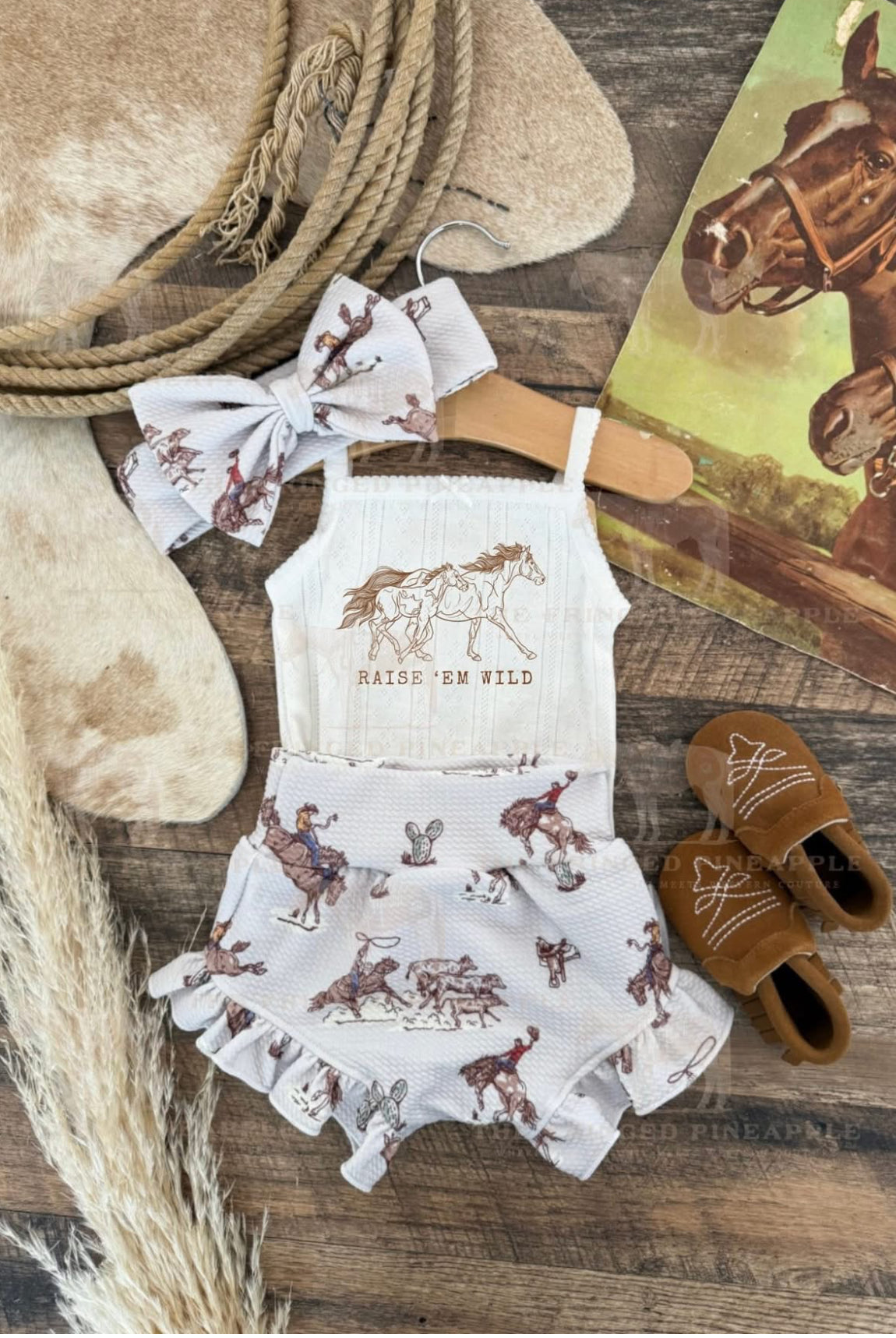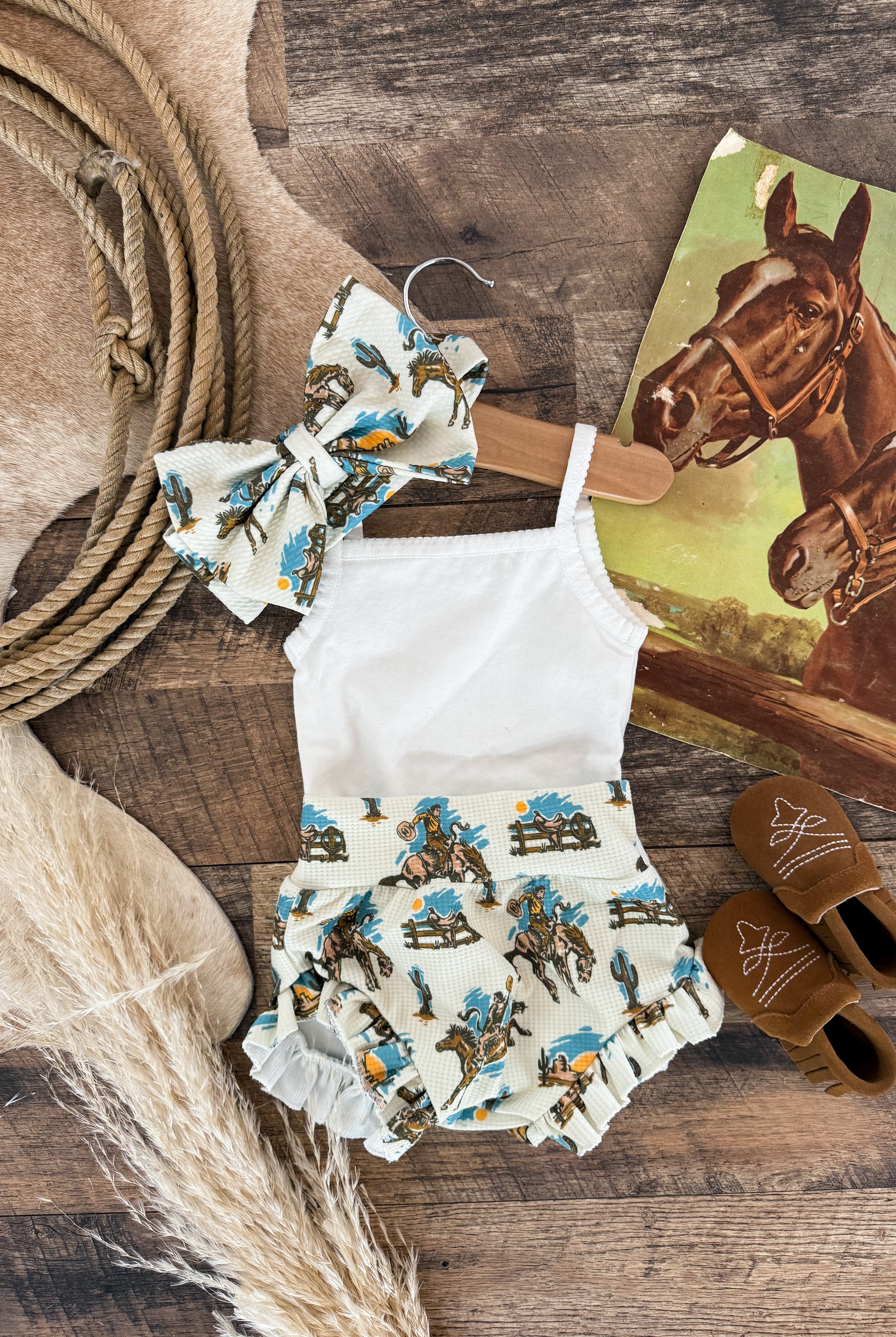 Custom designs, inspired by the western lifestyle, for cowkid at the rodeo or the buckaroo/cowgirl on the ranch. Western graphics tees & western onsies. Pattern western pajamas, and sets. Dressing the cowkids in the best western baby boutique clothing.