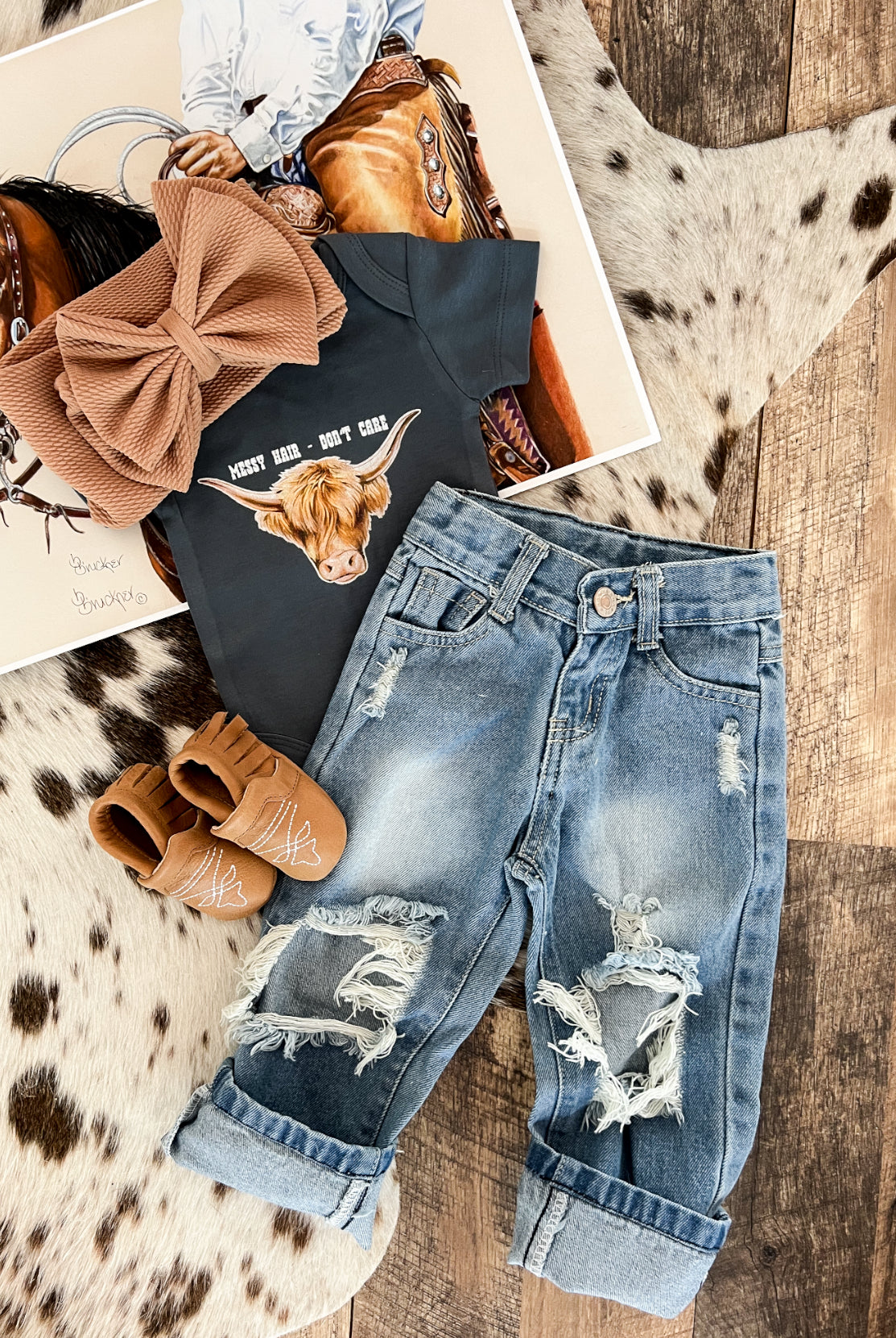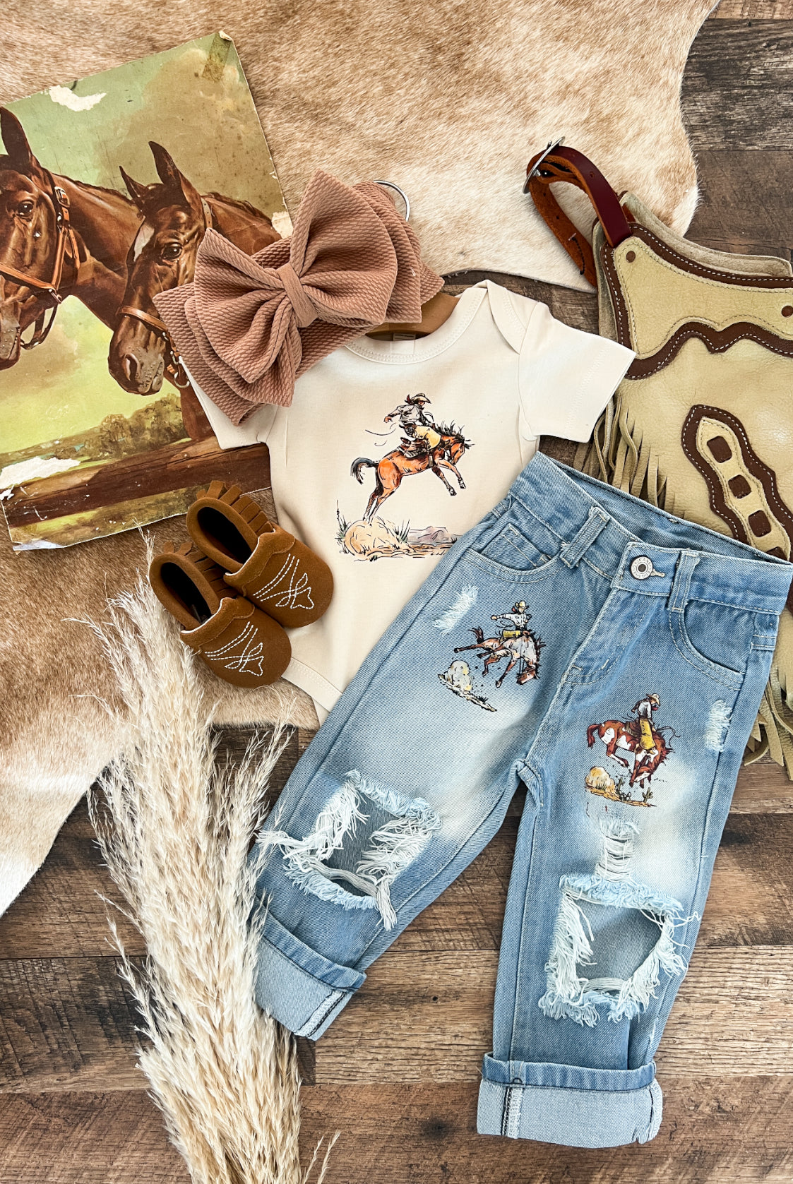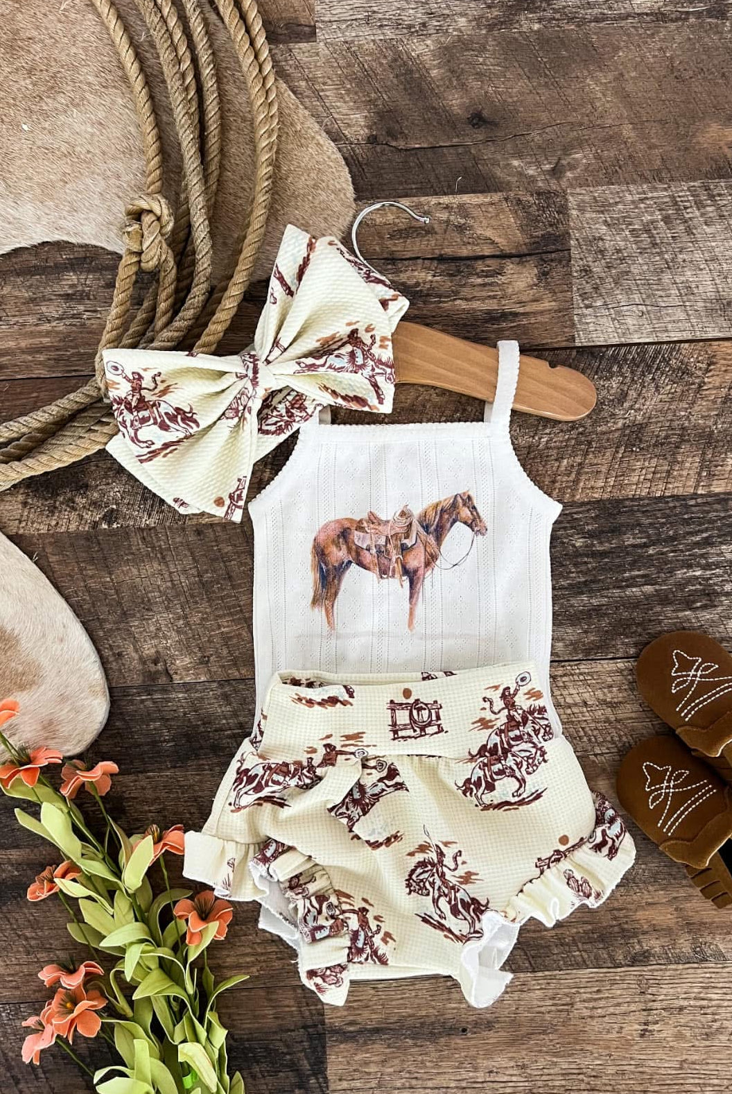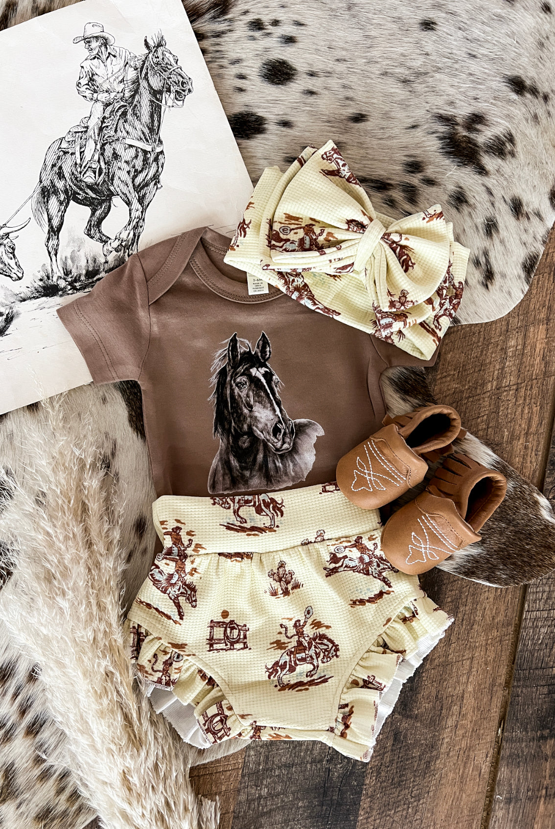 Custom designs, inspired by the western lifestyle, for cowkid at the rodeo or the buckaroo/cowgirl on the ranch. Western graphics tees & western onsies. Pattern western pajamas, and sets. Dressing the cowkids in the best western baby boutique clothing.