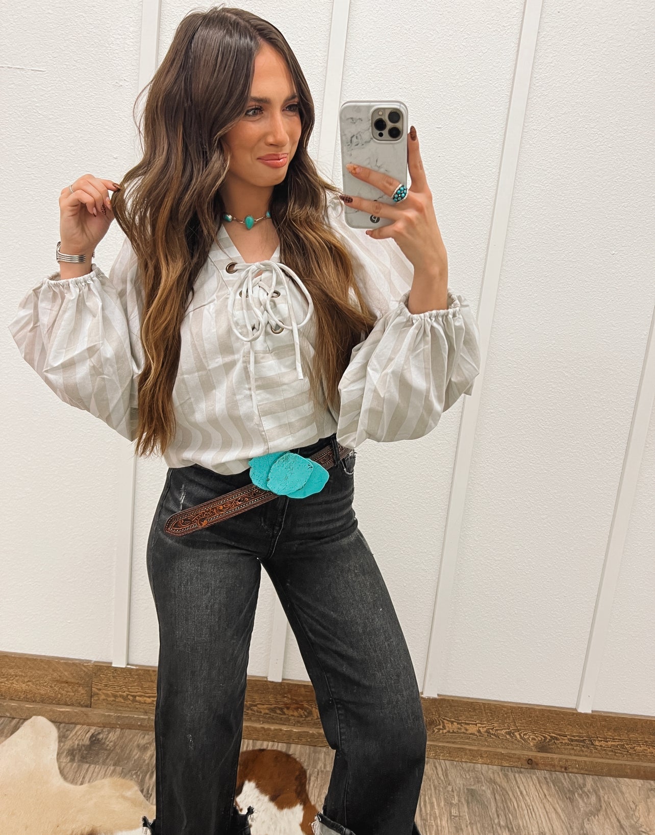 STRIPE WOVEN LACE UP BLOUSE TOP WITH BUBBLE SLEEVES