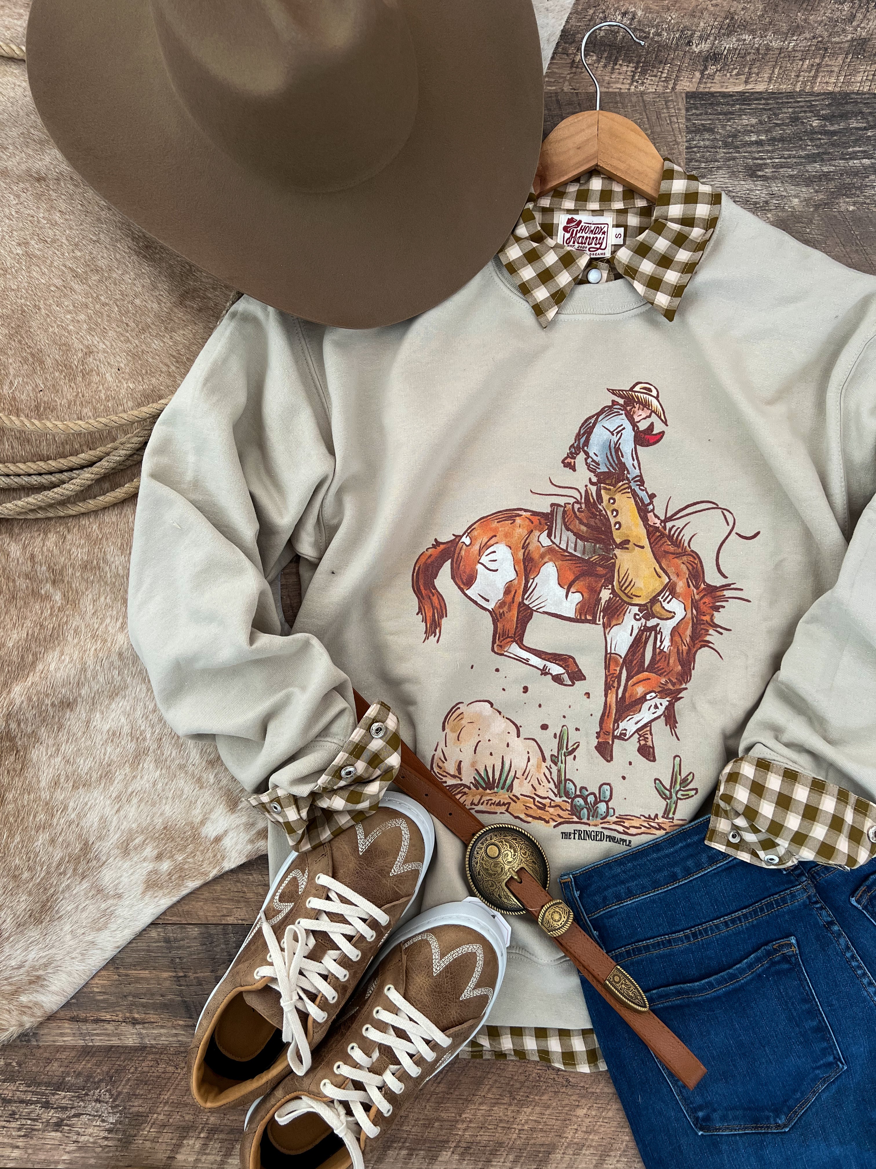 Designed for those who appreciate classic Western style, this taupe-colored sweatshirt features an original hand-drawn buckaroo bronc rider by artist Cody Witham. Crafted from an ultra-soft 8 oz. blend of 50% USA cotton and 50% polyester, it offers warmth, durability, and a relaxed fit. The ribbed collar, cuffs, and waistband with spandex ensure lasting comfort and shape retention.