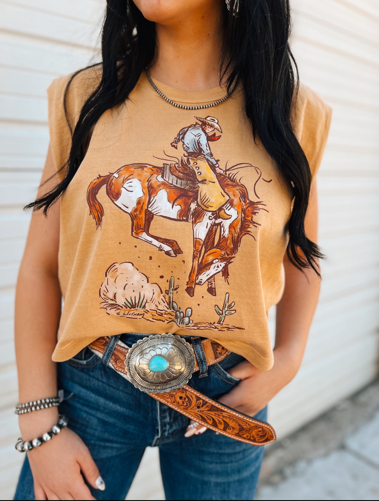 Hold on tight—'cause the Rank Paint Tank brings rodeo energy and vintage western vibes in one bold punch. Featuring a hand-drawn style graphic of a bronc rider taming a fierce paint horse, this mustard-toned muscle tank is made for the cowgirl who rides hard and dresses louder.