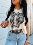 The Nuzzled Horses Tank is a heartfelt tribute to the unspoken connection between horses—and the cowgirls who love them. Featuring a stunning black-and-white graphic of two horses gently nuzzling, this padded shoulder tank blends western soul with feminine strength.
