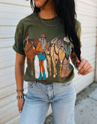 Round up your bestie and ride in style with the Cowgirl Duo Tee. Featuring a bold western graphic of two cowgirls and their horses, this olive green tee is all about friendship, freedom, and a whole lot of fringe.