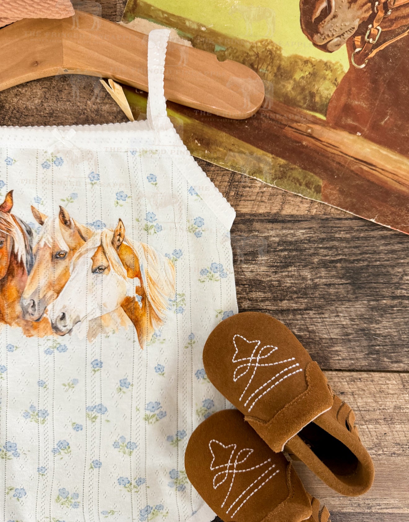 Western charm starts young! This adorable baby romper features a trio of watercolor horses on a soft floral print—perfect for your little cowgirl or cowboy. With sweet spaghetti straps, snap closures, and a lightweight cotton feel, it's made for comfort on the range (or nap time). Perfect for rodeo days, photo ops, or just looking cute on the ranch!