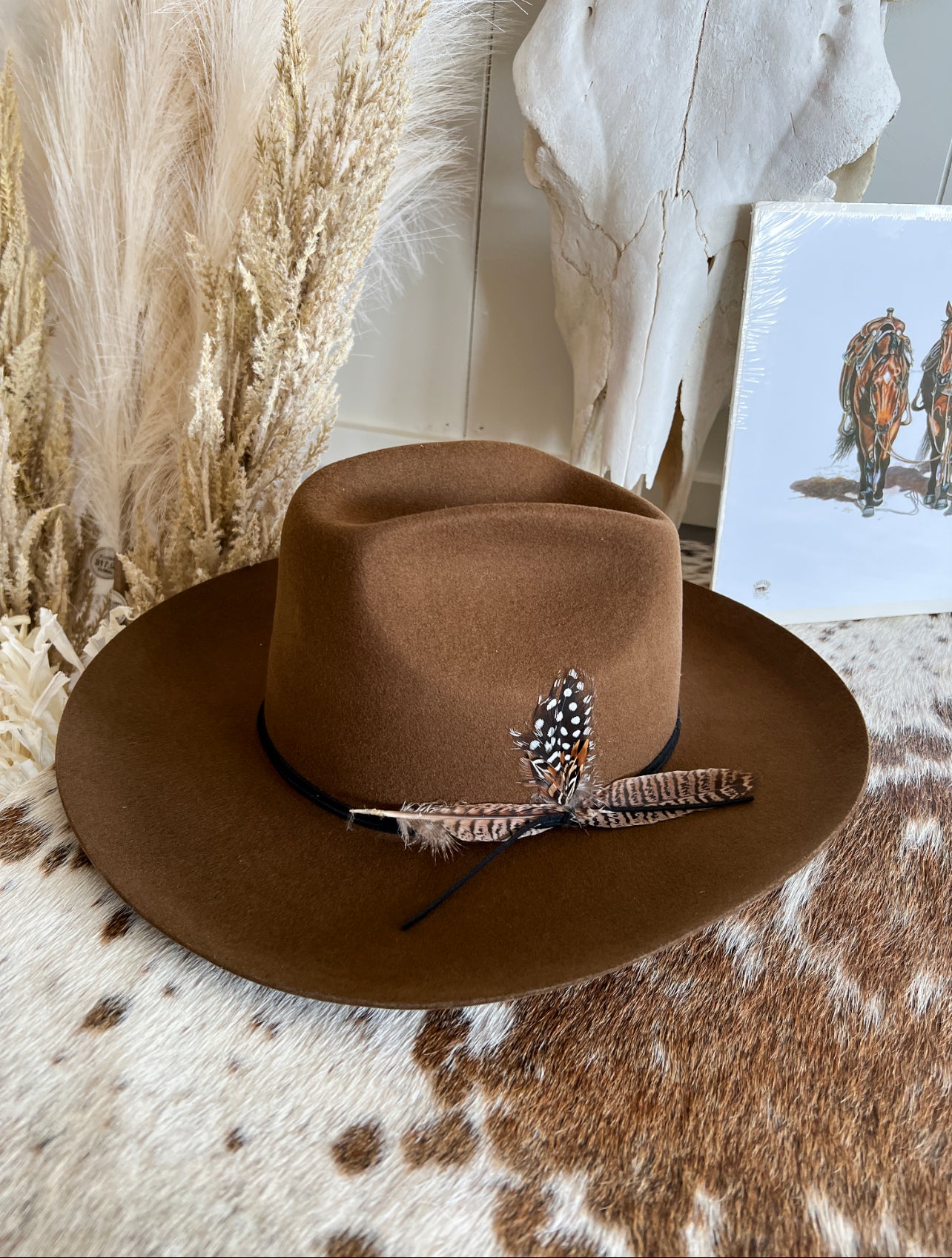 Beautiful feather detailed rancher cowboy hat with adjustable inner velcro strap for sizing and lining