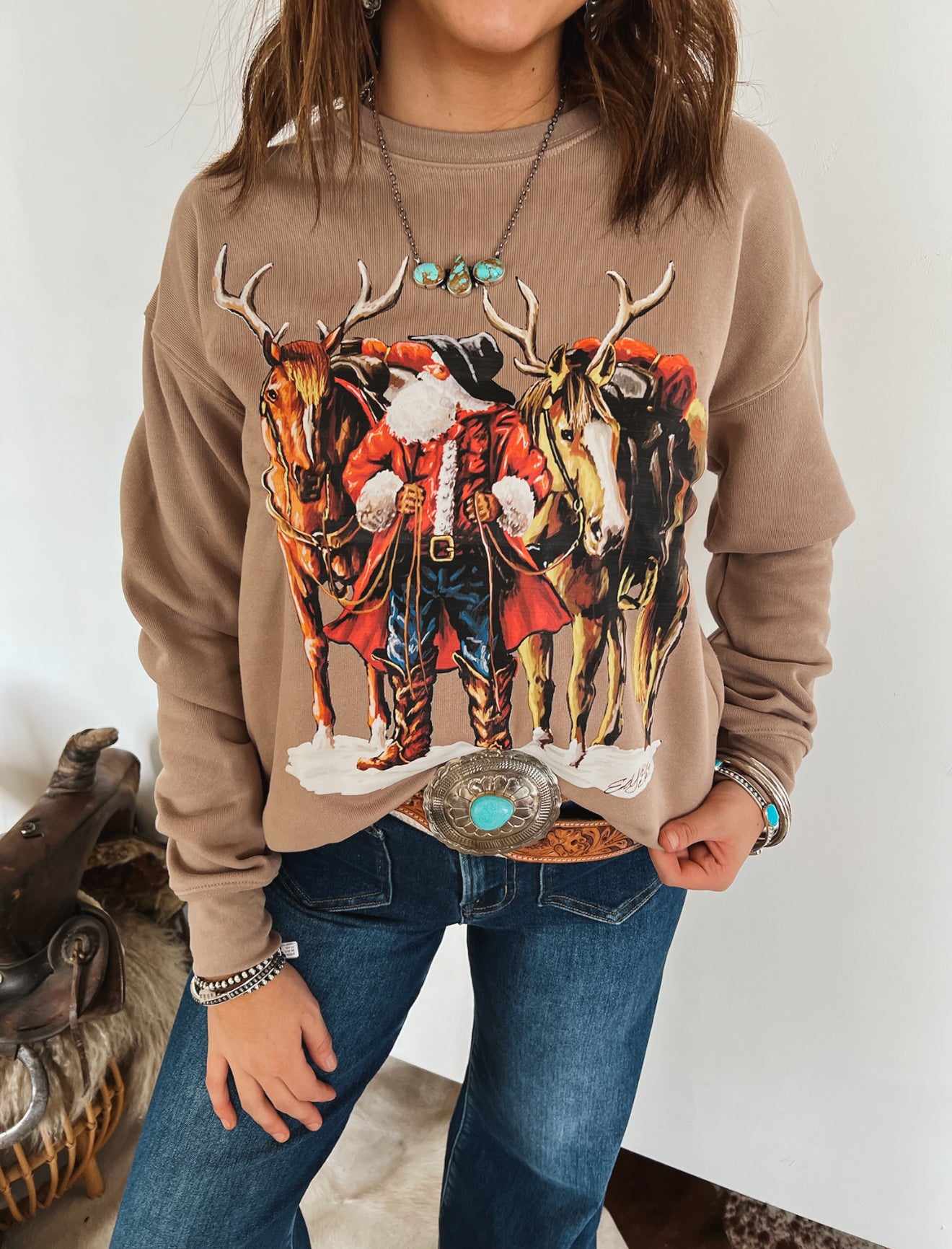 Cowboy Santa & His Reindeer Horses Sweatshirt or Tee (Tan)