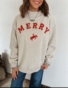Simple, Western, and effortlessly festive. This cozy oversized sweatshirt features a bold red MERRY graphic with a bucking horse silhouette for the perfect mix of ranch life and holiday spirit. It's a clean, minimal Western Christmas look that pairs easily with denim, leggings, or your favorite bell bottoms.